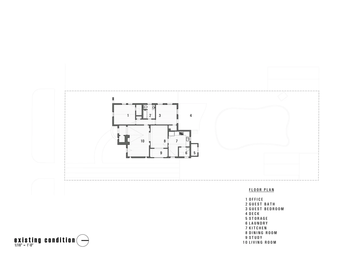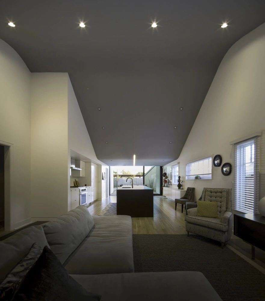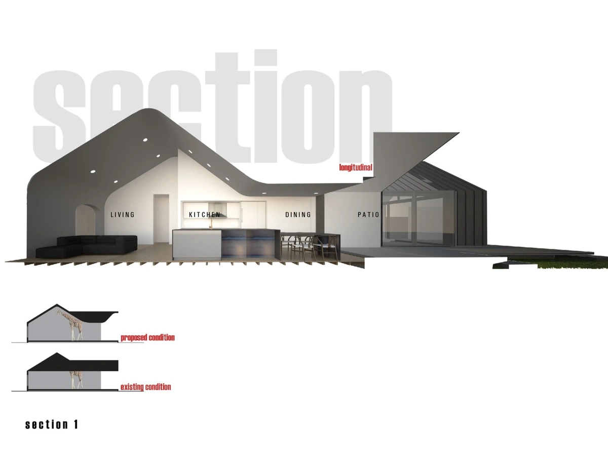 La vivienda existente de 100 m2 tenía un gran número de habitaciones pequeñas, con un jardín trasero de mayor extensión que la casa. Por tanto, la renovación se centró en eliminar divisiones interiores y ampliar el espacio a costa de sacrificar parte de la zona verde.