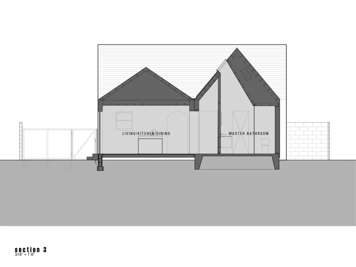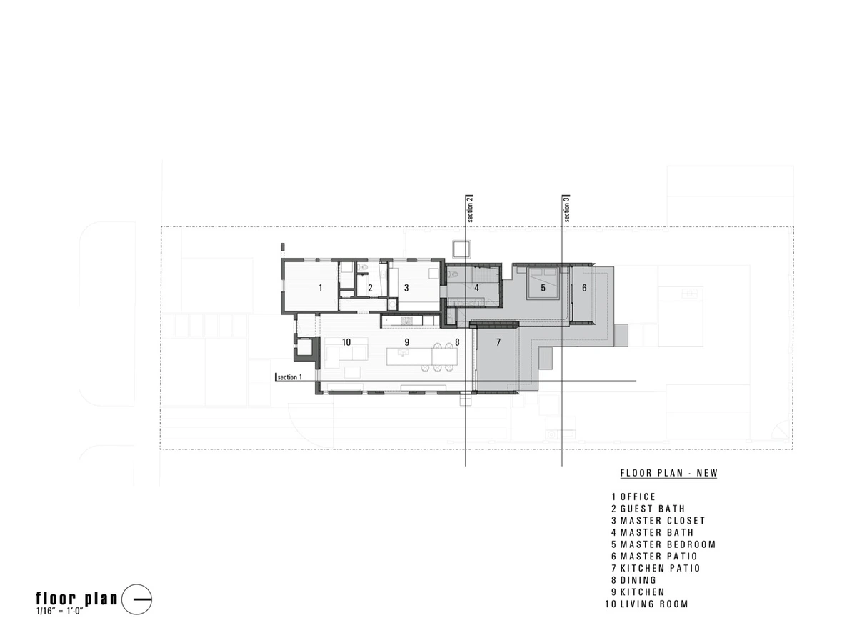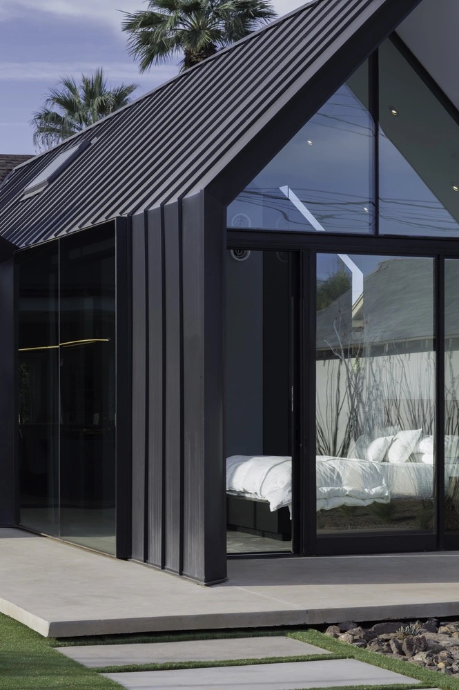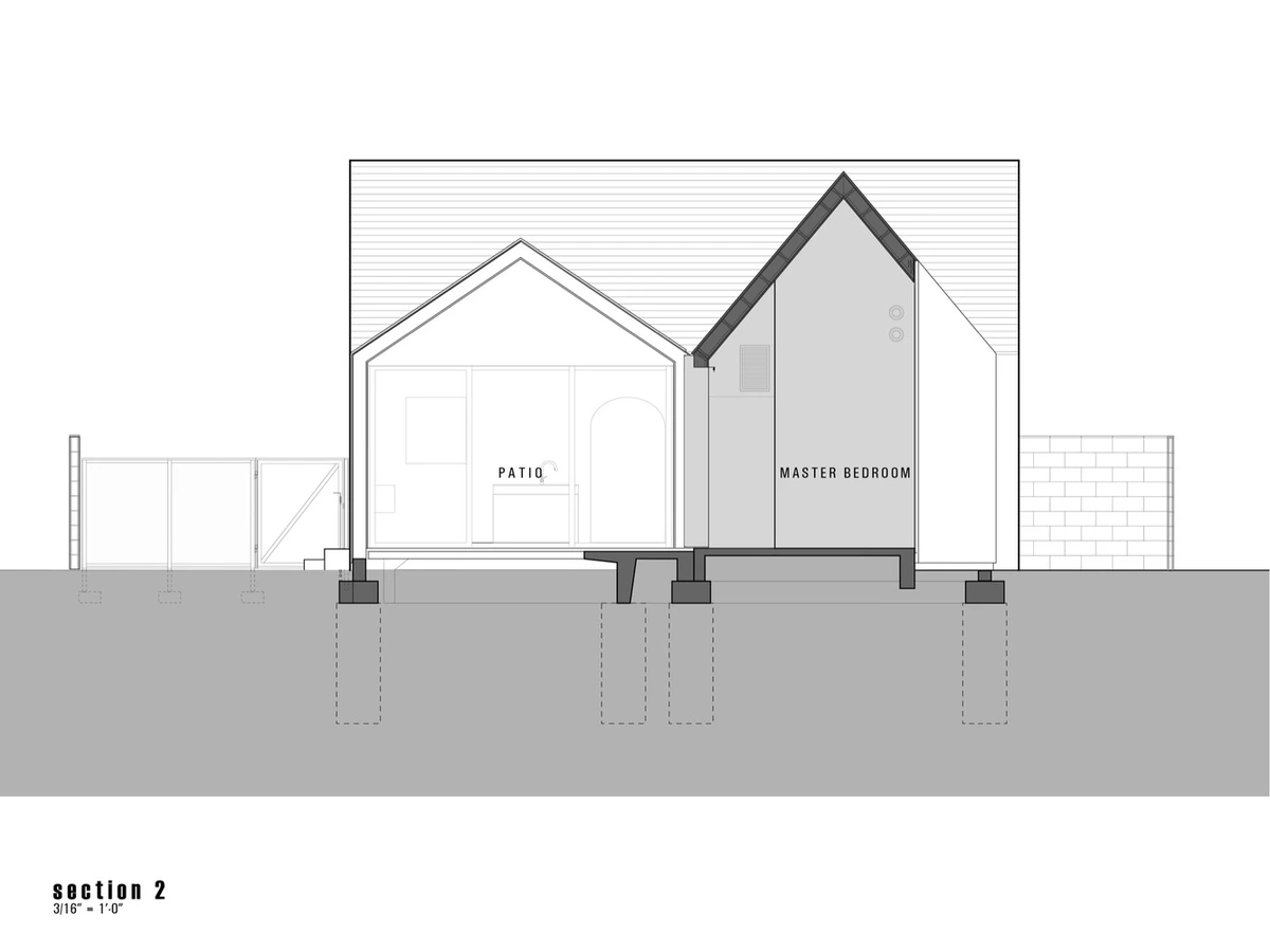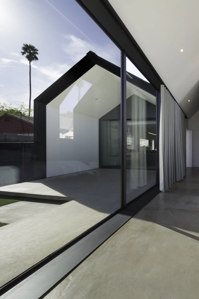 La ampliación (de 37 m2) incluye ahora el dormitorio principal y otro baño, junto a dos patios retranqueados, uno como punto de unión con el jardín y el otro a modo de transición entre la herencia de la primera mitad del siglo XX y los tiempos modernos. Este último se convierte en un área abierta y multifuncional gracias a los abundantes acristalamientos de suelo a techo del anexo, las puertas correderas y los voladizos.