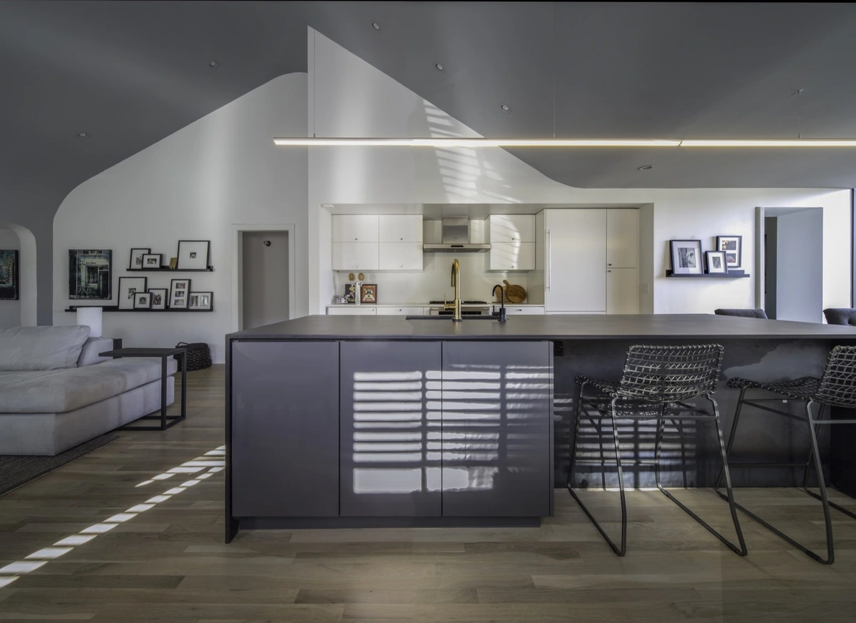 Se unificaron la sala de estar, el comedor y la cocina suprimiendo las paredes existentes. Además, se aprovechó el volumen que ocupaba el ático para despejar todavía más la zona, lo que originó un estilo abovedado en el salón, manteniendo la altura inicial en cocina y comedor.