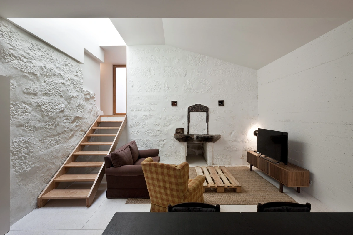 El proyecto de renovación del arquitecto Guilherme Machado Vaz ha transformado este edificio tradicional de planta baja del siglo XIX en una casa de dos niveles. De la construcción original se conservan las paredes de piedra, potenciando su textura rugosa en diversas zonas de la vivienda.