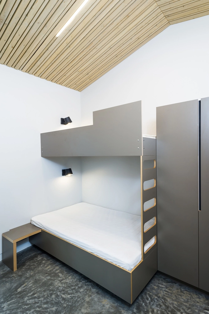 En el interior, la sala de estar y el comedor se unen a la cocina en un espacio diáfano con acceso al resto de habitaciones, lo que casi elimina el pasillo. Por su parte, el baño cuenta con comunicación directa hacia la bañera de hidromasaje de la terraza. Respecto a la decoración, se optó por el hormigón pulido en los suelos y un revestimiento de paneles de madera para los techos, que replica el patrón de listones exterior. Las paredes en blanco potencian la luminosidad, aunque el mobiliario gris en cocina y dormitorios, junto con la carpintería metálica del mismo color, le dan a la casa cierto aire tristón.