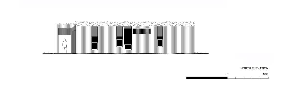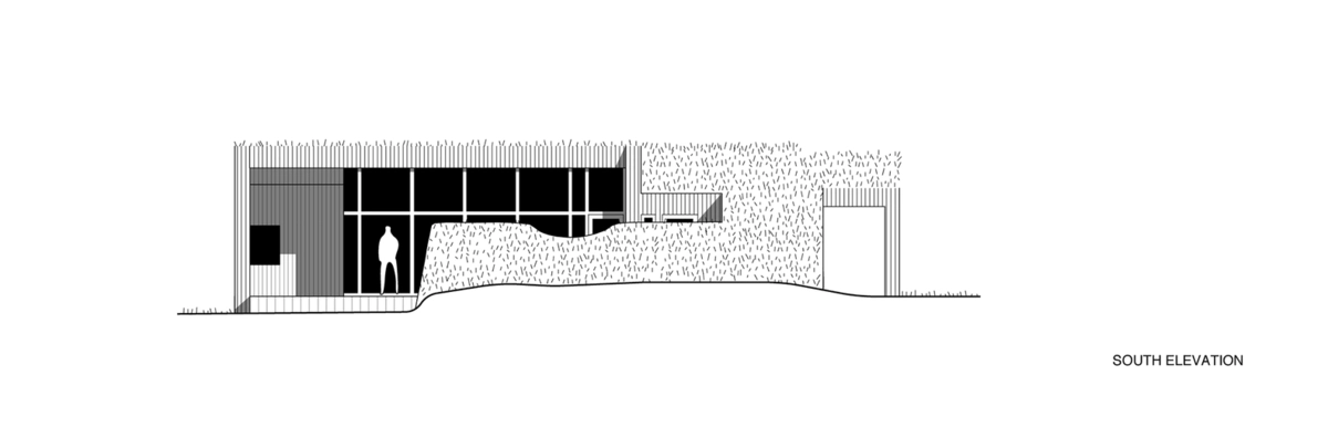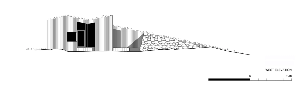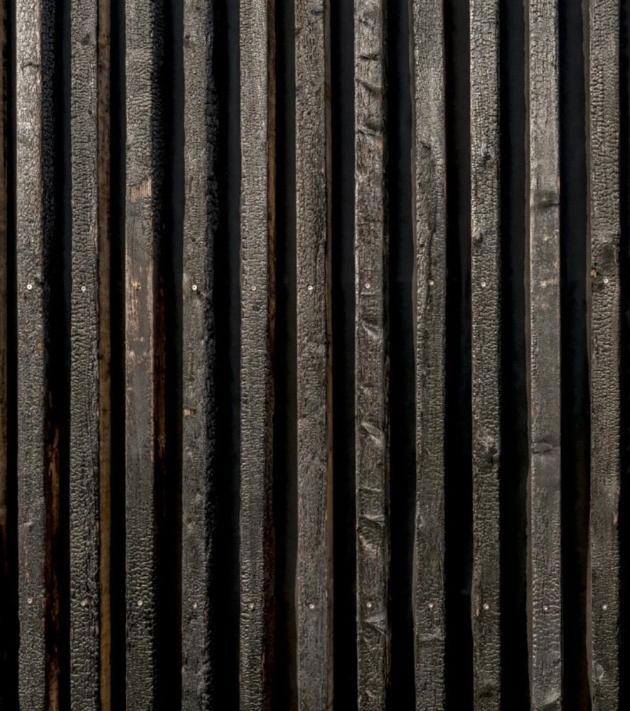 Las construcciones de una sola planta en madera descansan sobre una base de hormigón. En cuanto al exterior, se revistió con listones de madera quemada, una forma de preservar dicho material bastante usada en Japón y otros países. El contraste con los colores verde y pardo de los pastos resulta muy atractivo, encajando también con el entorno montañoso de fondo.