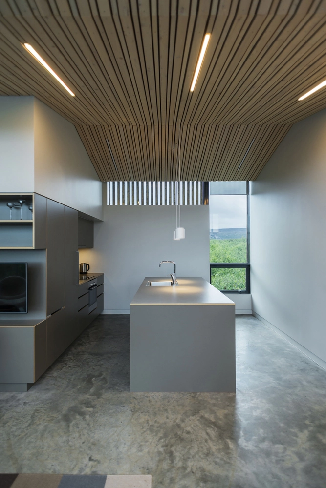 Las cabañas de PK Arkitektar cumplen con todos los estándares ecológicos, presentando una huella de carbono muy próxima a cero. Y, por supuesto, aprovechan la naturaleza volcánica de la isla como fuente de energía geotérmica para todas las viviendas.