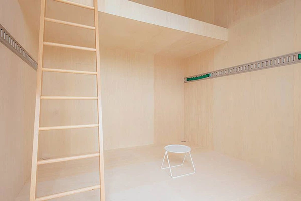 Inspirado en la tecnología de fabricación ligera de los camiones de reparto, sus paredes tienen un núcleo de espuma aislante entre el aluminio exterior corrugado y la madera contrachapada del interior. Sus dos pisos, conectados a través de una escalera y cerrados por paneles deslizantes, son tan espartanos que no albergan ni baño ni cocina, siendo quizá por ello la menos atractiva de las tres propuestas.