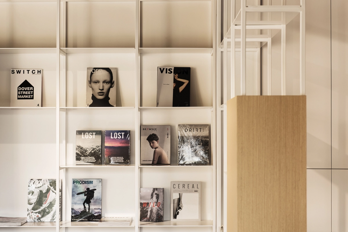 En el interior, se dio protagonismo a la exhibición de las revistas, con una gran área de estanterías en madera y acero revestido de color blanco. Dada la limitada superficie de este edificio de una sola planta (70 m2), se diseñó un espacio casi diáfano con zonas que favoreciesen la concentración y el bienestar de los lectores.
