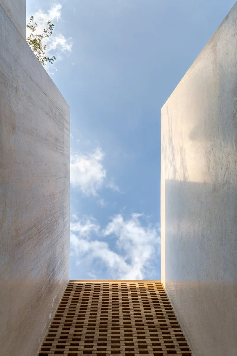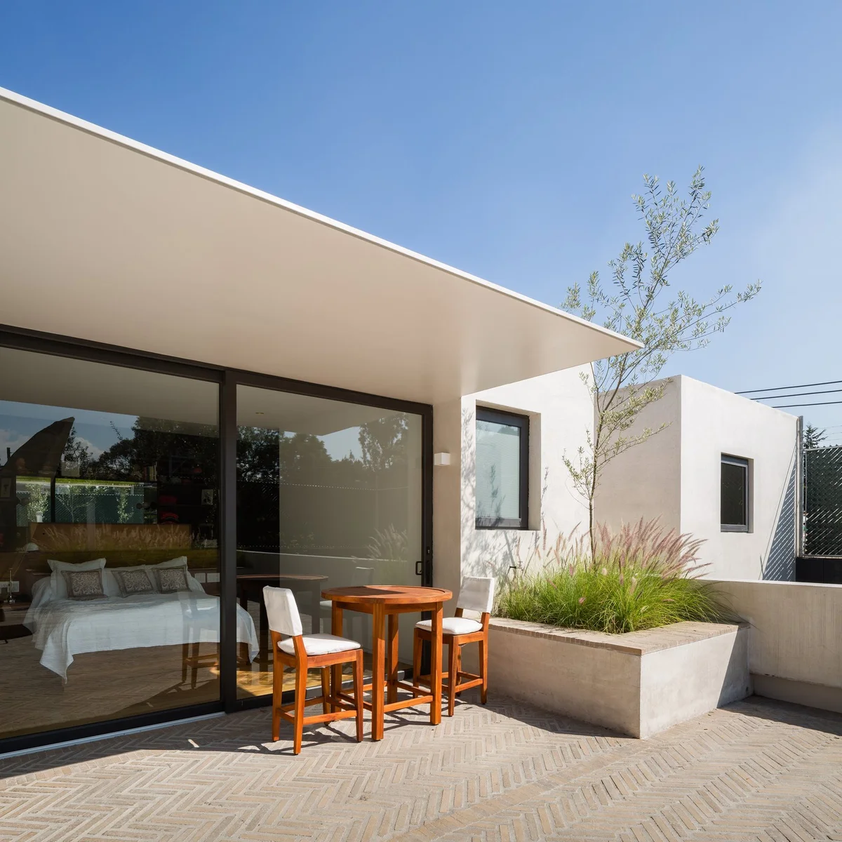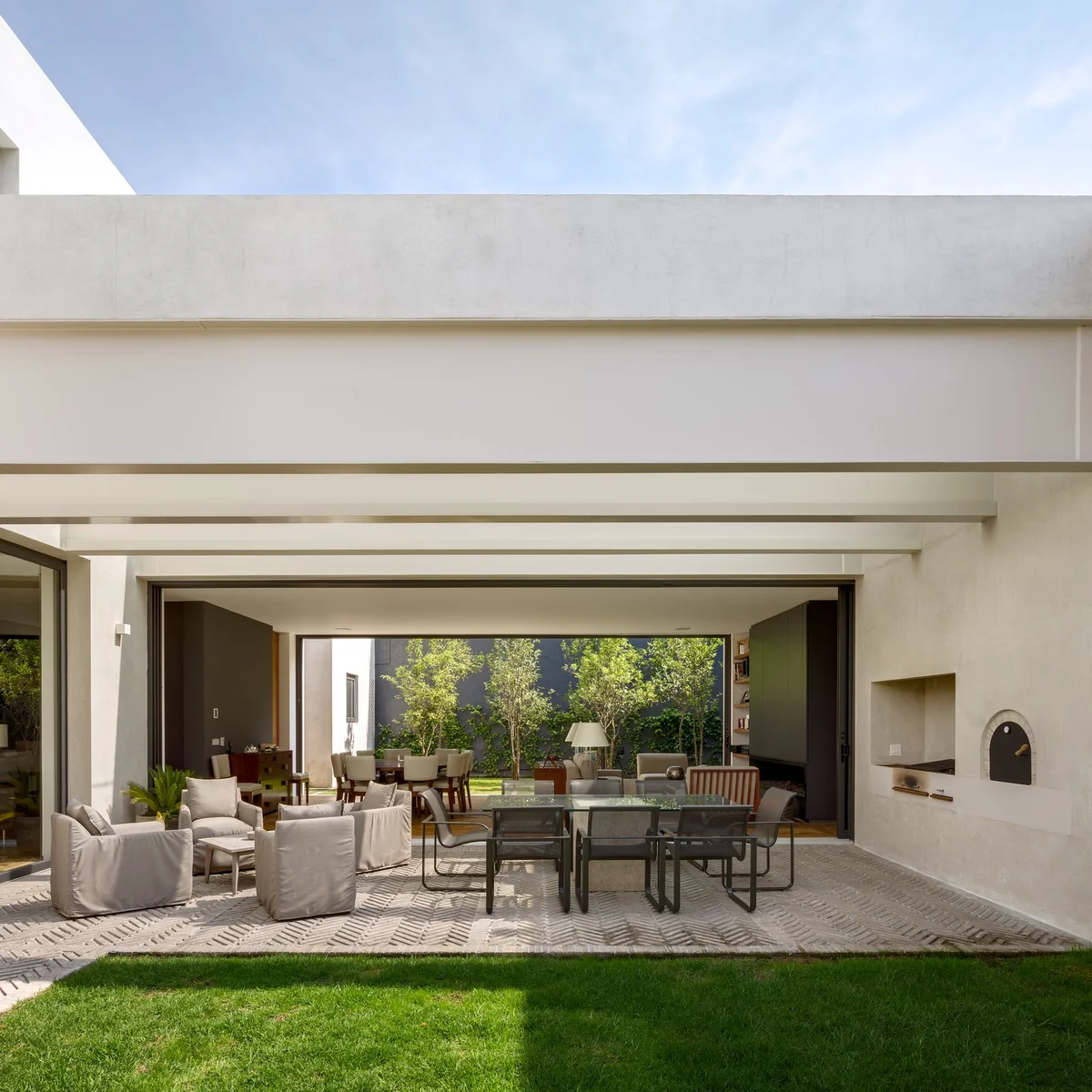 La abundancia de grandes ventanales correderos contribuye a fomentar la vida en el exterior, mientras que la inclusión de dobles alturas, aleros y celosías en puntos estratégicos mitiga los rigores del sol, refrescando el interior.