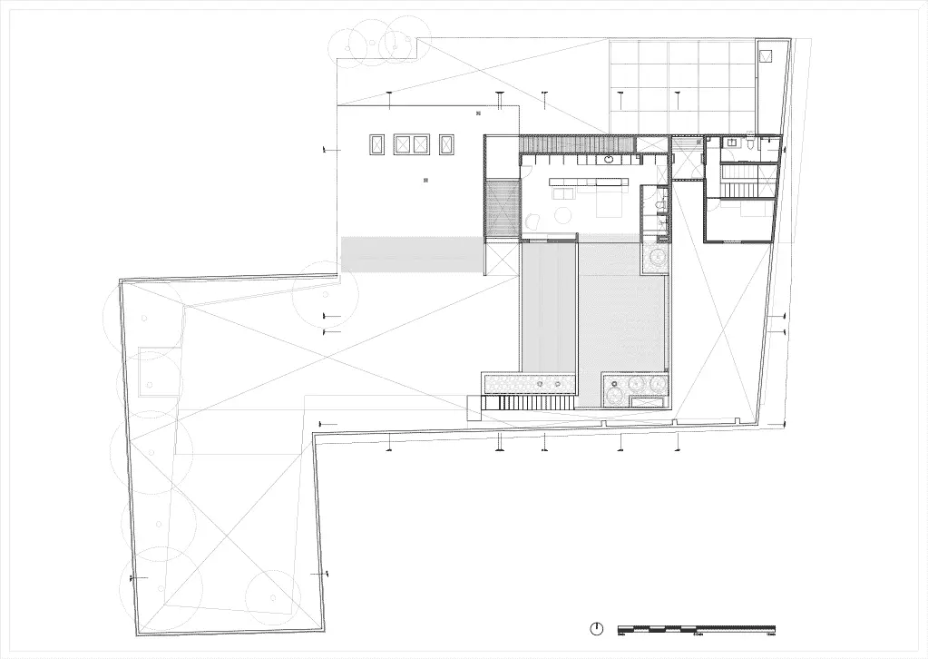 La planta baja se concibió para realizar toda la vida cotidiana, por lo que este nivel incluye el dormitorio principal, todas las zonas comunes y el área de servicios. El piso superior se reservó como dormitorio de invitados y dispone de una terraza.