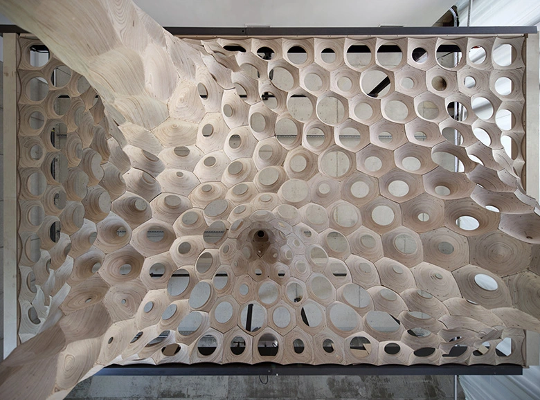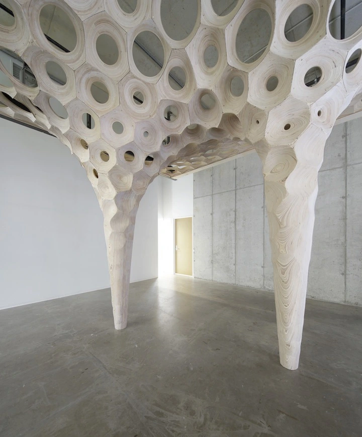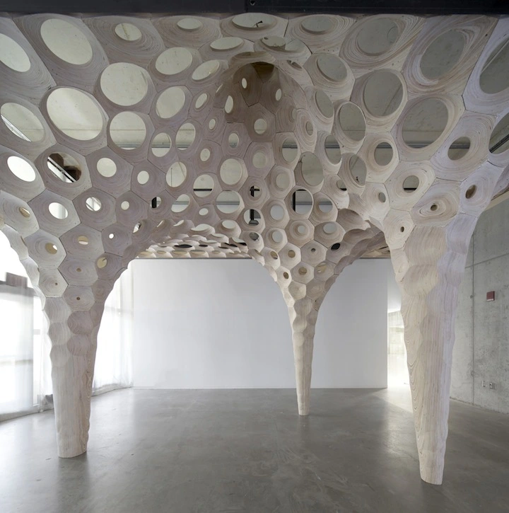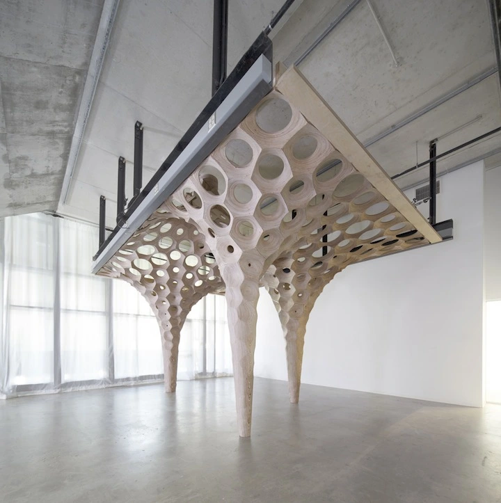 Los diseñadores de matterdesign Brandon Clifford y Wes McGee, son los creadores de esta estructura de madera mediante la cual, abordan la importancia de la relación entre el material, la carga y estabilidad y su esencia en el espacio.