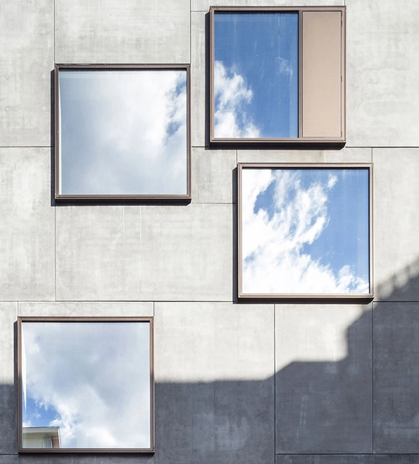El contraste de materiales entre lo nuevo y lo antiguo contribuye al aspecto general del hotel, en un barrio de viviendas neo-clásicas en su mayoría. El nuevo edificio está construido en hormigón de gran calidad (antracita) y se restauró el revoque de la mansión existente. Se tuvieron muy en cuenta medidas sostenibles como la re-utilización del agua de lluvia, ventilación con recuperación del calor, aislantes térmicos y vidrios bajo emisivos; caldera de alto rendimiento y un pequeño molino de viento para generar electricidad.