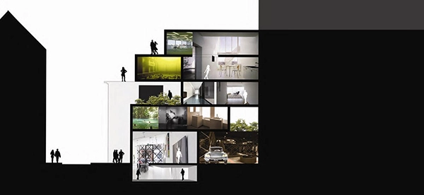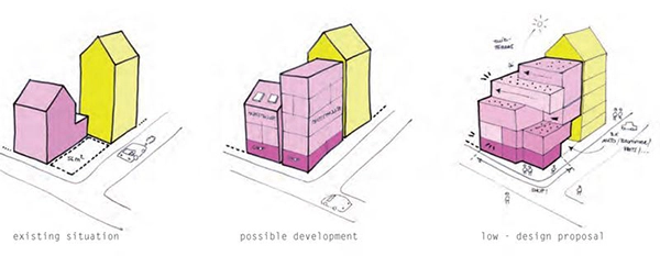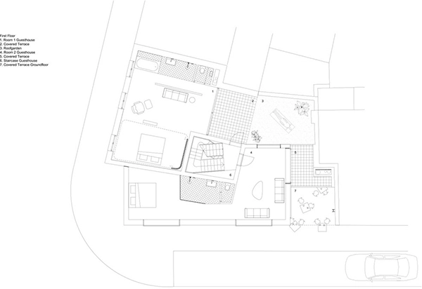 LOW transformó una vivienda única en hotel y ático dúplex. El edificio neoclásico existente era valioso históricamente y se renovó completamente. Para crear espacio extra para visitantes, restaurante, tienda, galería y apartamento duplex se añadió una extensión inevitable al solar adyacente. Los espacios residenciales están separados por generosos espacios exteriores a base de terrazas y tejados ajardinados. El nuevo volumen se integra perfectamente con los alrededores e invita a un interesante dialogo entre lo nuevo y lo viejo. El ángulo representa la transición entre las diferentes alturas de los edificios en ambas calles. El nuevo volumen se levantó y se fue cortando gradualmente para crear un cuerpo ligero desde el punto de vista volumétrico; esto generó espacio para grandes terrazas privadas, con vistas a las zonas interiores y la calle. Gracias a esta unión entre lo interior y lo público se consiguió luz extra para una calle relativamente oscura.