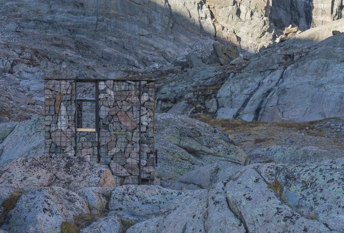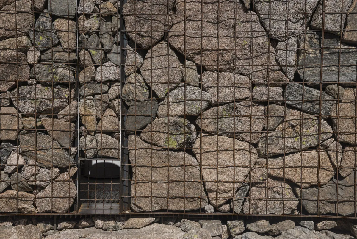 Los aseos se sustentan mediante cuatro muros de gaviones delimitados con tela metálica. En su interior, los bloques de piedra recogidos en la zona actúan como lastre. Cada una de las aletas de acero incluidas entre los módulos de gaviones triangula las cargas laterales dentro de la estructura. A su vez, una placa de anillo las conecta con el resto de paredes, equilibrando las fuerzas. De esta manera se consiguió rebajar los 46 centímetros recomendados para los muros de piedra hasta solo 30, lo que redujo el impacto ambiental en la flora en un 33 %.