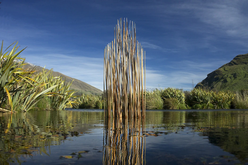 Otras veces, las esculturas son flexibles y parecen flotar, como la denominada Sinergia, donde una red invisible de hilos de lino sostiene en el aire multitud de cañas de raupo -una planta típica de los humedales neozelandeses- que no llegan nunca a tocarse.