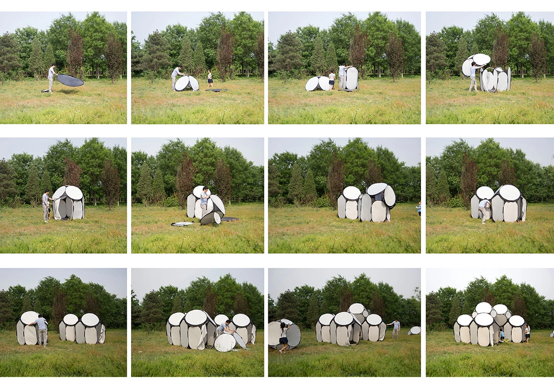 Estos discos de tela reflectante -circulares o alargados- se unen entre sí solo con velcro, por lo que cualquiera puede ensamblarlos sin herramientas. Cada módulo consta de dos partes, que pueden plegarse y ser transportadas en pequeños paquetes independientes. Una característica muy útil, pues permite también convertir los paneles planos en una tienda cerrada en cuestión de minutos.