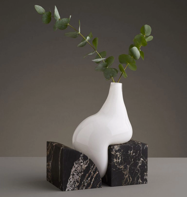 Una de las primeras referencias que nos viene a la mente cuando contemplamos estos Indefinite Vases son los archiconocidos relojes blandos de Dalí. Pero aparte de esa fluidez espontánea que logra Olovsson, también juega con los contrastes de color. Jarrones transparentes, levemente tintados o blancos se deslizan por las vetas del mármol o por las diferentes tonalidades del ónice y el granito.