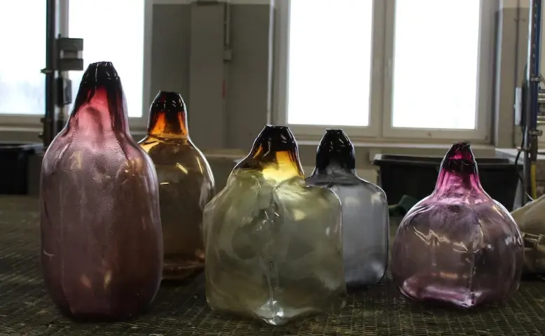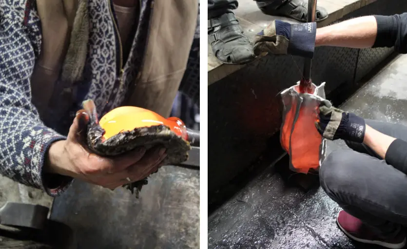 A partir de piezas de tela ignífuga cosidas entre sí, Vogel construye unos sobres que sirven como recipiente temporal del vidrio nada más salir del horno. Una vez colocado dentro, este material plástico se expande para llenar el espacio mediante técnicas de soplado, mientras otro artesano ajusta el cierre de la parte superior tirando de los hilos internos de cobre situados en el extremo de la bolsa.
