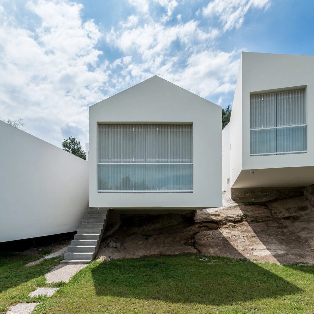 La iluminación también se cuidó al máximo. Los grandes ventanales regulan la luz mediante un sistema de «persianas» de metal perforado, que tamizan la incidencia del sol y funcionan también como un elemento de seguridad. Así mismo, el color blanco de toda la estructura exterior, incluidos los tejados, proporciona una sensación de uniformidad brillante a esta urbanización en miniatura. Algo así como una identidad propia que se desmarca de las demás viviendas del vecindario, integrándose sin estridencias en el paisaje natural de la sierra.