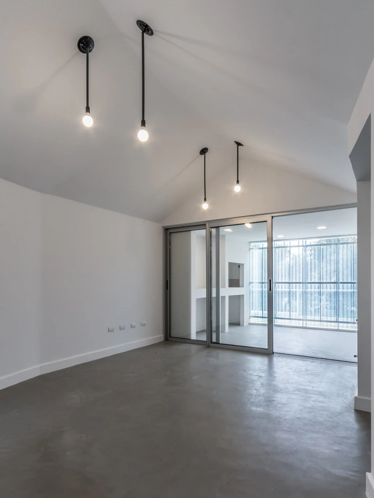 El acceso a estas 5 unidades de 100 m2 sin aleros se efectúa a través de escaleras flotantes de hormigón colocadas entre los dos volúmenes, lo que potencia aún más la sensación de liviandad de los bloques.