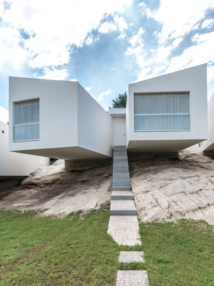 Sin embargo, en lugar de optar por una nivelación de la parcela, con el consiguiente impacto en un entorno con abundante vegetación, el problema se sorteó asentando las viviendas en voladizo sobre la roca. La decisión de aprovechar la topografía natural del lugar y la consiguiente sobreelevación potenció, además, unas mejores vistas sobre el lago San Roque desde el interior de cada hogar.
