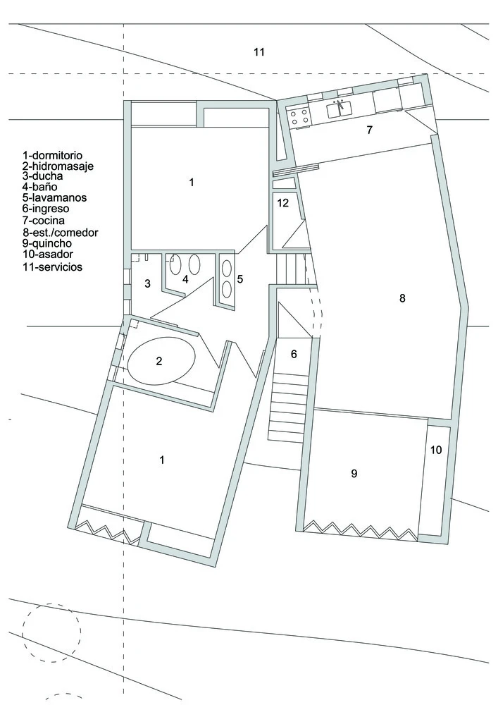 La creatividad de Ciravegna se tradujo en un modelo de casas no lineales que generó una especie de villa o pequeño pueblo. Cada una de ellas aparece desdoblada en dos alas: una privada, con dos dormitorios y un gran baño –dividido en sectores– que incorpora jacuzzi y ducha escocesa; y otra pública, que incluye la sala de estar, la cocina y una zona equipada con asador en el área de voladizo que puede abrirse como una terraza al aire libre.