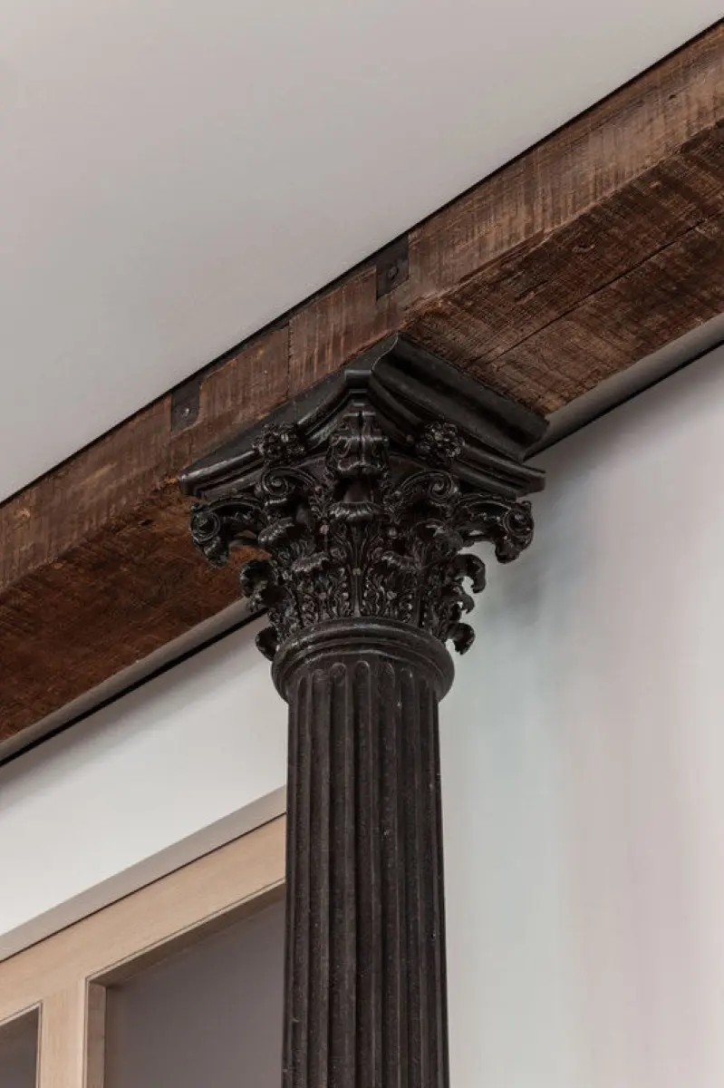 El diseño, minimalista, elegante y limpio permite que la luz natural fluya sin obstáculos, enfatizando las características arquitectónicas del local (columnas de fundición, vigas de madera), creando una atmósfera serena y apacible.