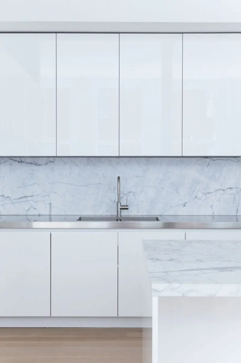 El uso de elementos como el acero inoxidable y las superficies de trabajo de mármol realzan la estética contemporánea, mientras que los gabinetes de madera añaden calidez y carácter.
