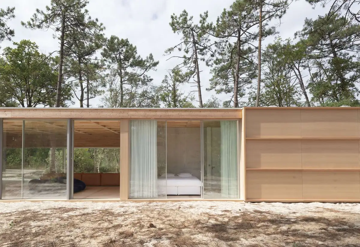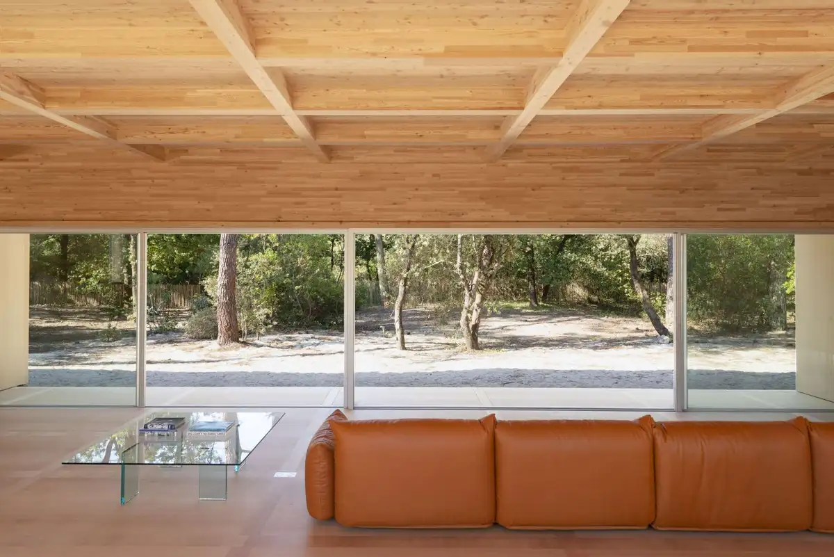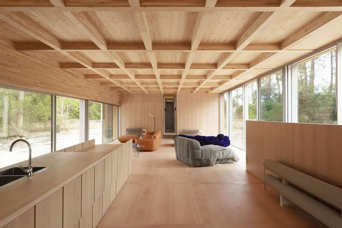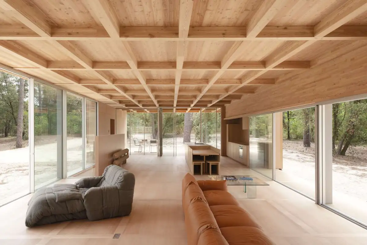 La arquitectura de la Maison en Bois redefine la idea de umbral. No hay una entrada tradicional; en cambio, uno ingresa directamente al espacio público de la vivienda o a una de las cinco habitaciones, todas situadas en medio del bosque de pinos. Este enfoque no solo borra la distinción entre interior y exterior, sino que también invita a la naturaleza a formar parte integral del hogar.