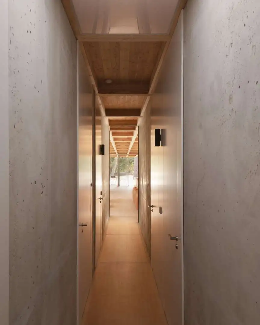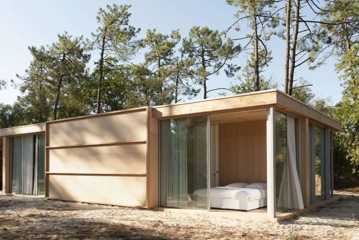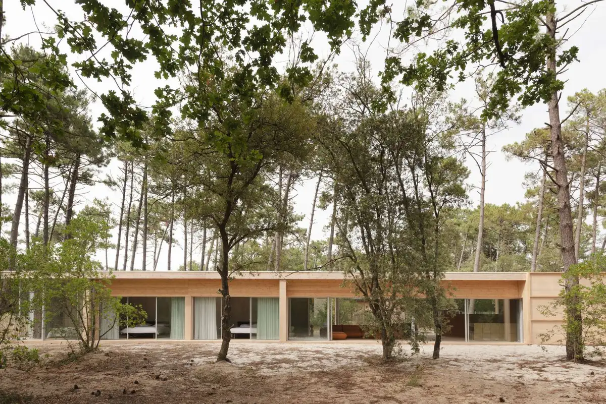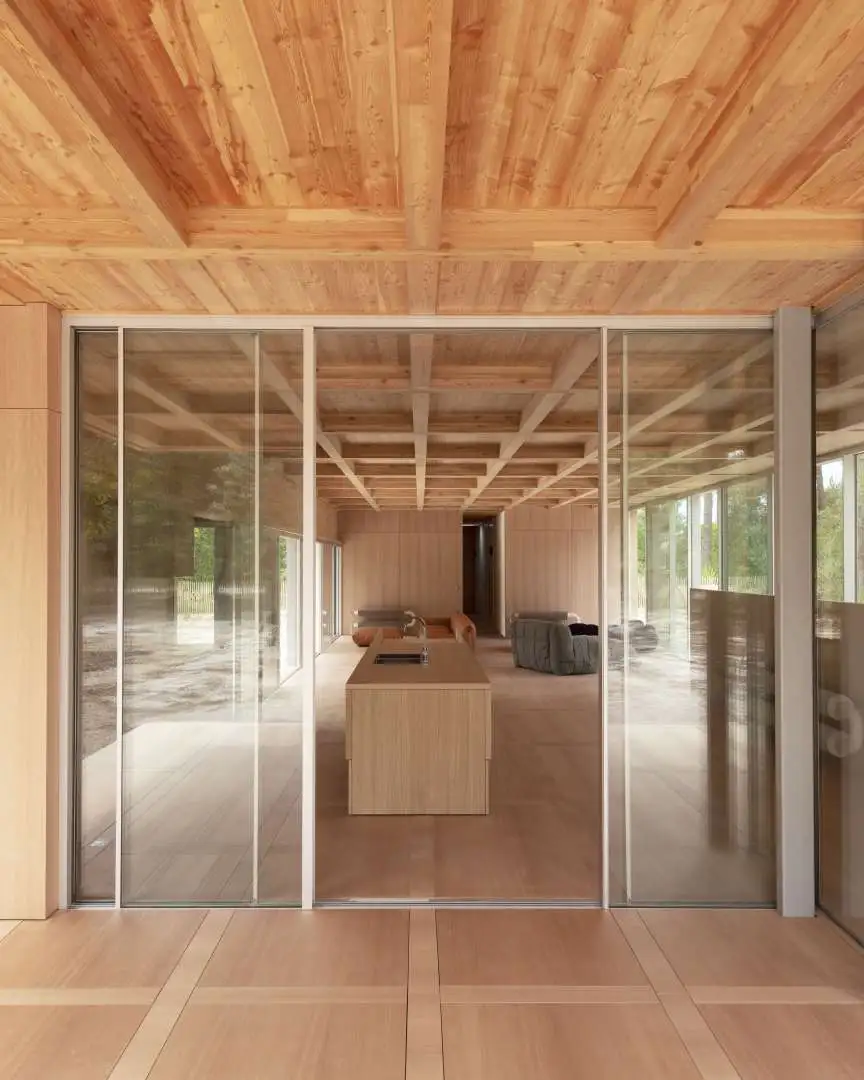 La arquitectura de la Maison en Bois redefine la idea de umbral. No hay una entrada tradicional; en cambio, uno ingresa directamente al espacio público de la vivienda o a una de las cinco habitaciones, todas situadas en medio del bosque de pinos. Este enfoque no solo borra la distinción entre interior y exterior, sino que también invita a la naturaleza a formar parte integral del hogar.