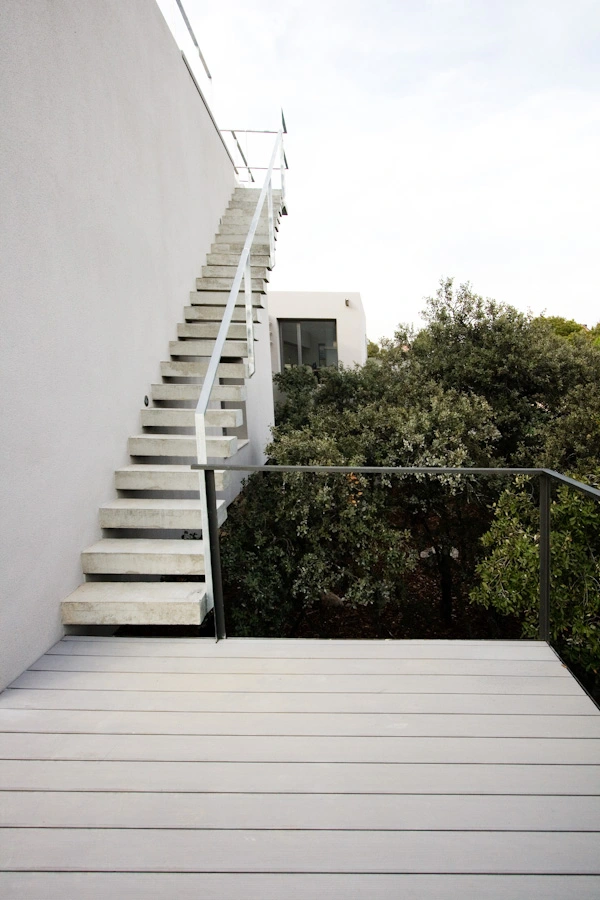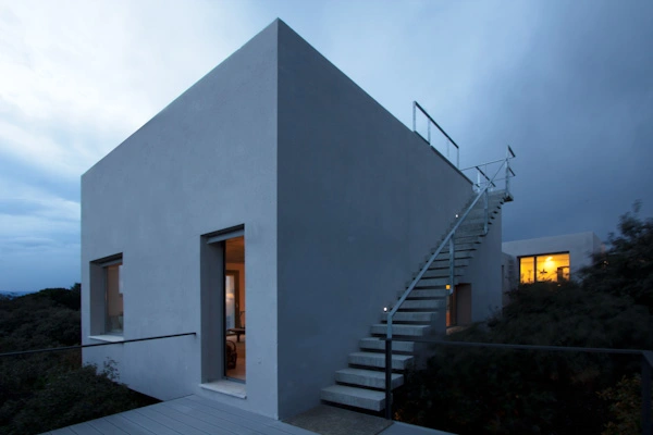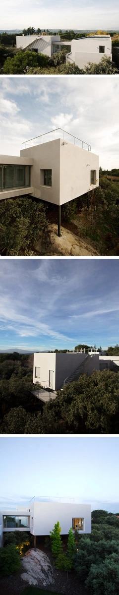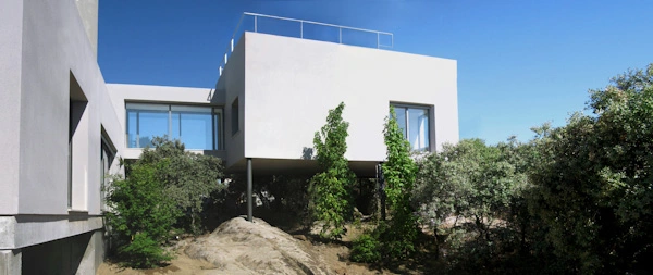 Por las características del terreno y la vegetación, la vivienda se concibió en dos cuerpos unidos por una pasarela transparente. Uno de los volúmenes se construyó como un palafito sobre roca de granito de alta resitencia. Para conseguir las perforaciones exactas donde apoyar la estructura, se trajeron unas máquinas especiales que cortaban con discos de diamante.