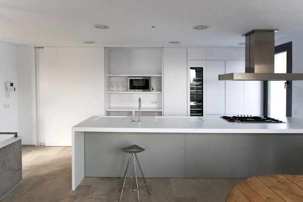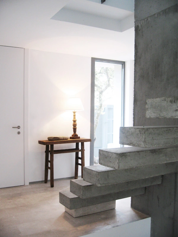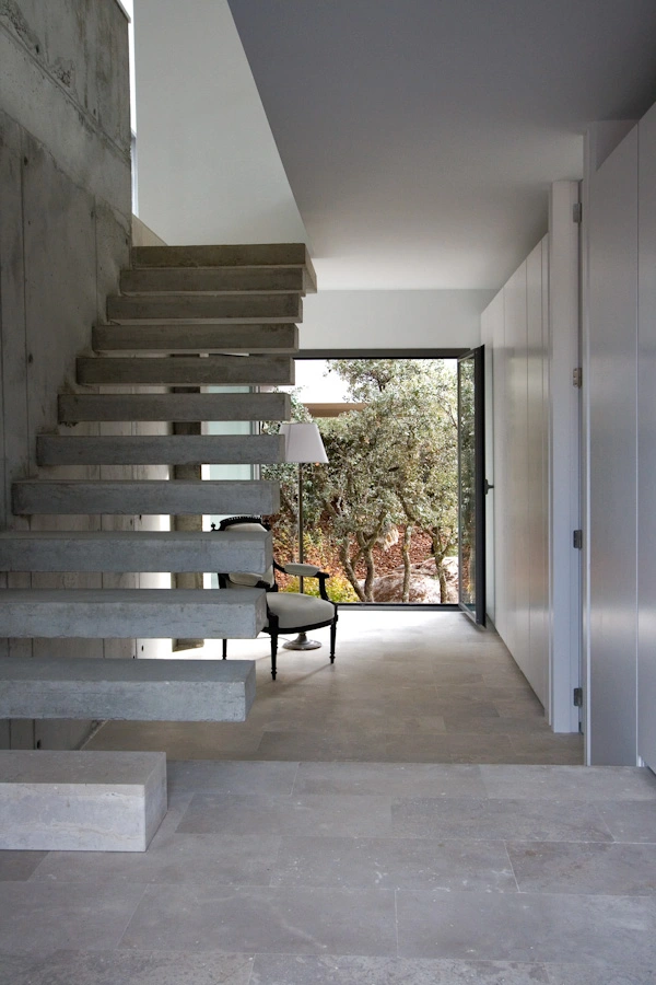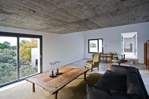Materiales: solados de piedra caliza. Muros de hormigón armado y cerramientos de fachada de ladrillo y revestido de mortero monocapa. Cubiertas planas con acabado en grava. Carpintería de madera de DM lacado en blanco. Puerta de acceso a vivienda de acero. Carpintería de aluminio lacado.