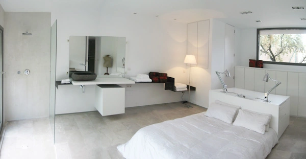 La vivienda no se relaciona con el entorno si no que se apodera de él porque lo visualiza desde todos los ángulos. Nuestro cliente tenía gran interés en diferenciar las zonas para uso público y las zonas privadas. Así, se ubicaron el salón, la cocina y la piscina en la planta alta y la zona de dormitorios y baños en la planta baja.