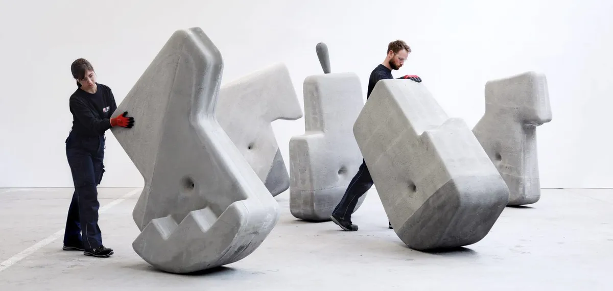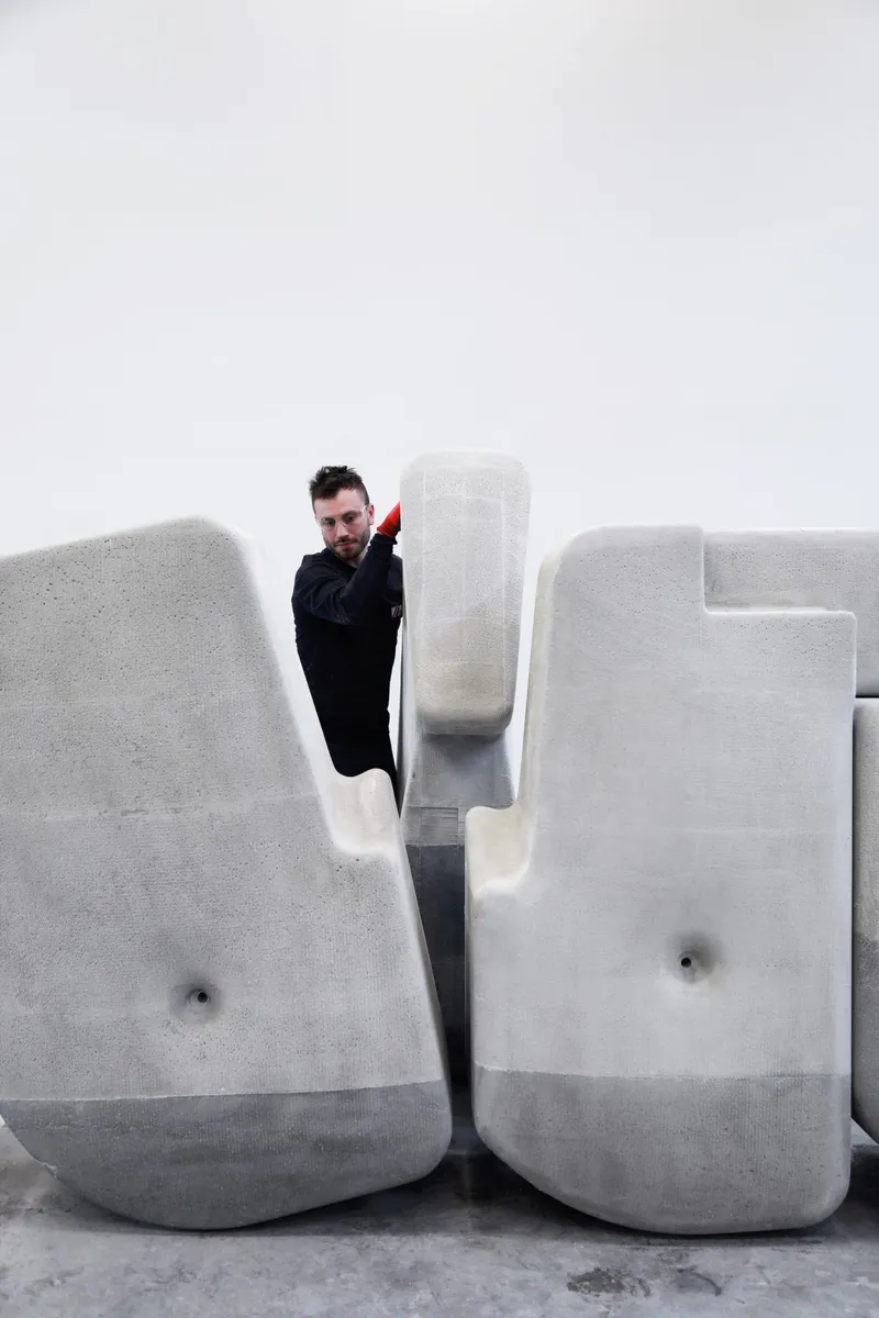 En su proyecto «Walking Assembly» consigue armar un rompecabezas entrelazando enormes piezas de hormigón para formar una pared y una escalera lateral al estilo de la arquitectura inca. En total, la escultura pesa casi seis toneladas, pero los bloques individuales pueden rotar y trasladarse sin apenas esfuerzo, simplemente con las manos.