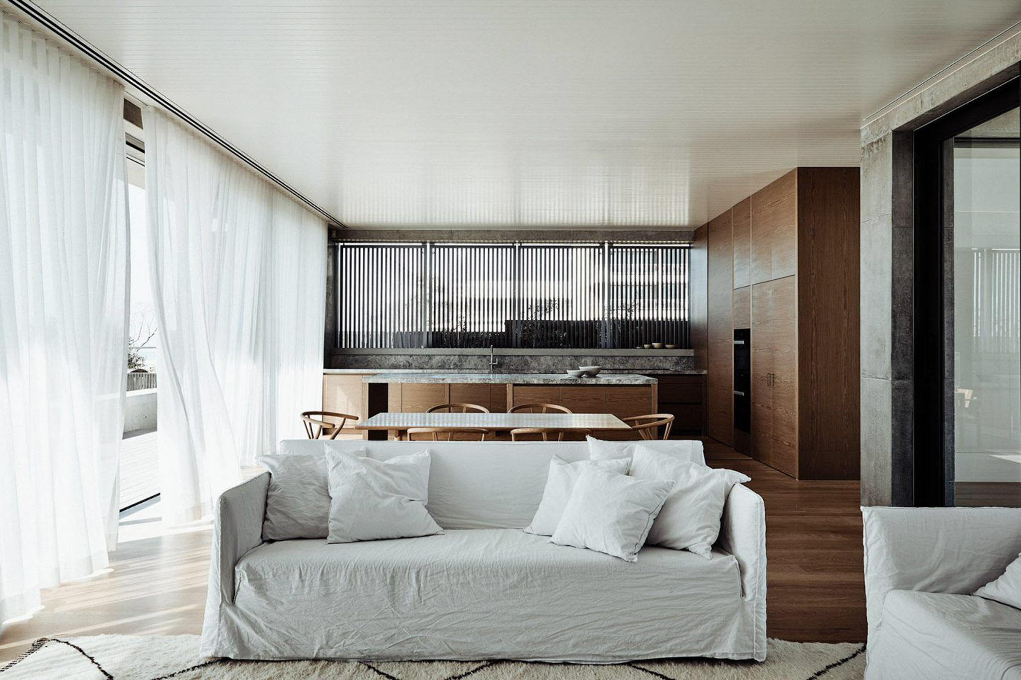 La madera aparece como contrapunto cálido: en carpinterías, persianas exteriores y algunos acabados interiores. No se trata solo de contraste estético; la madera protege del sol excesivo y mejora la habitabilidad mediante su tacto y su respuesta higroscópica. La combinación de estos dos materiales —concreto y madera— genera un equilibrio entre dureza y confort perceptivo.