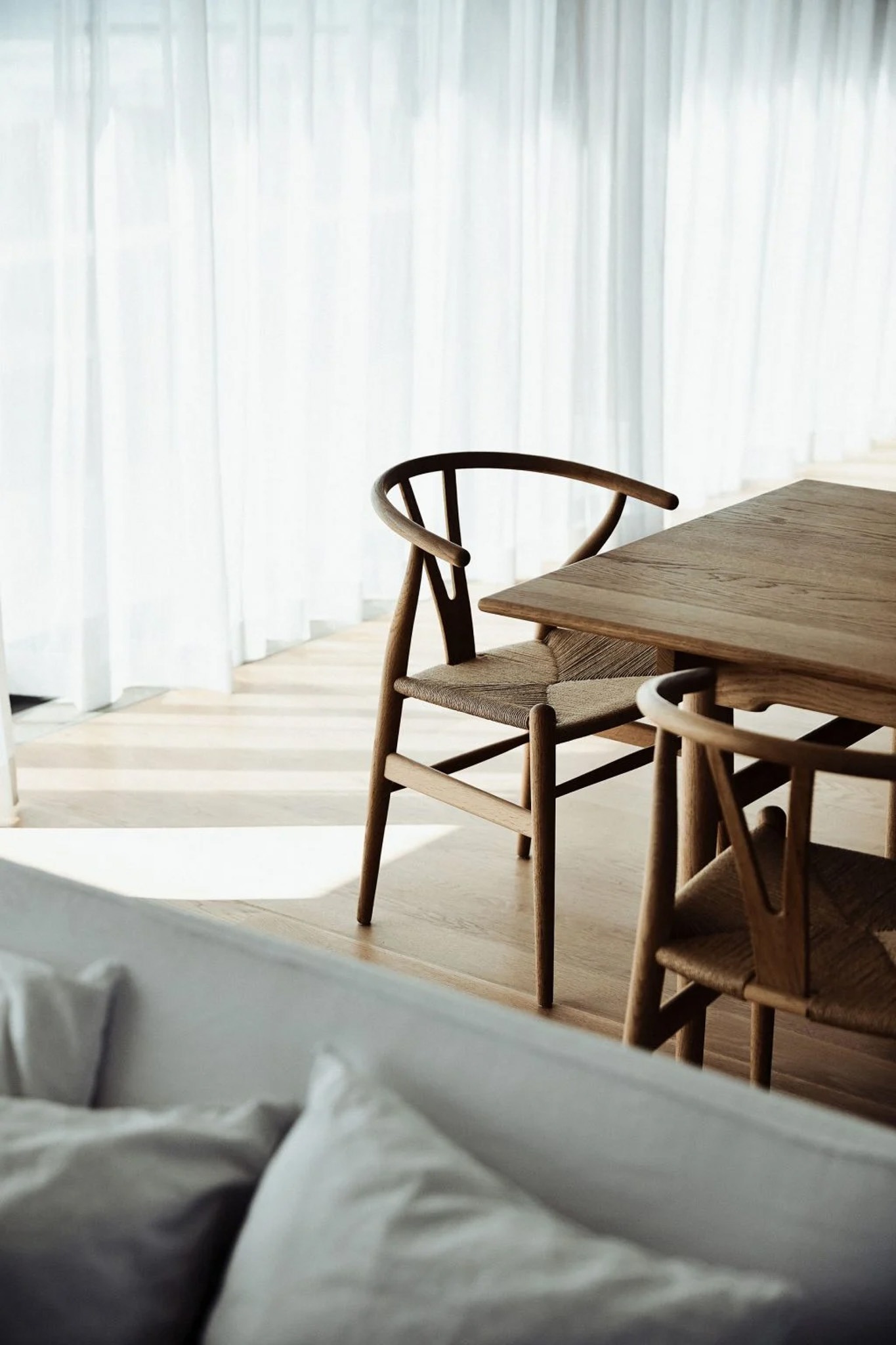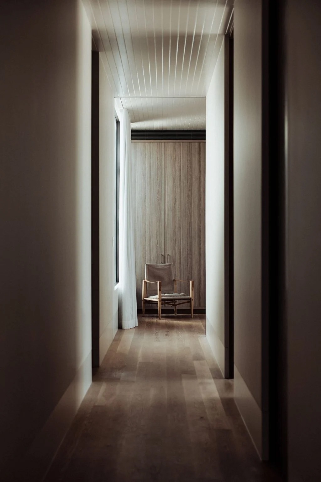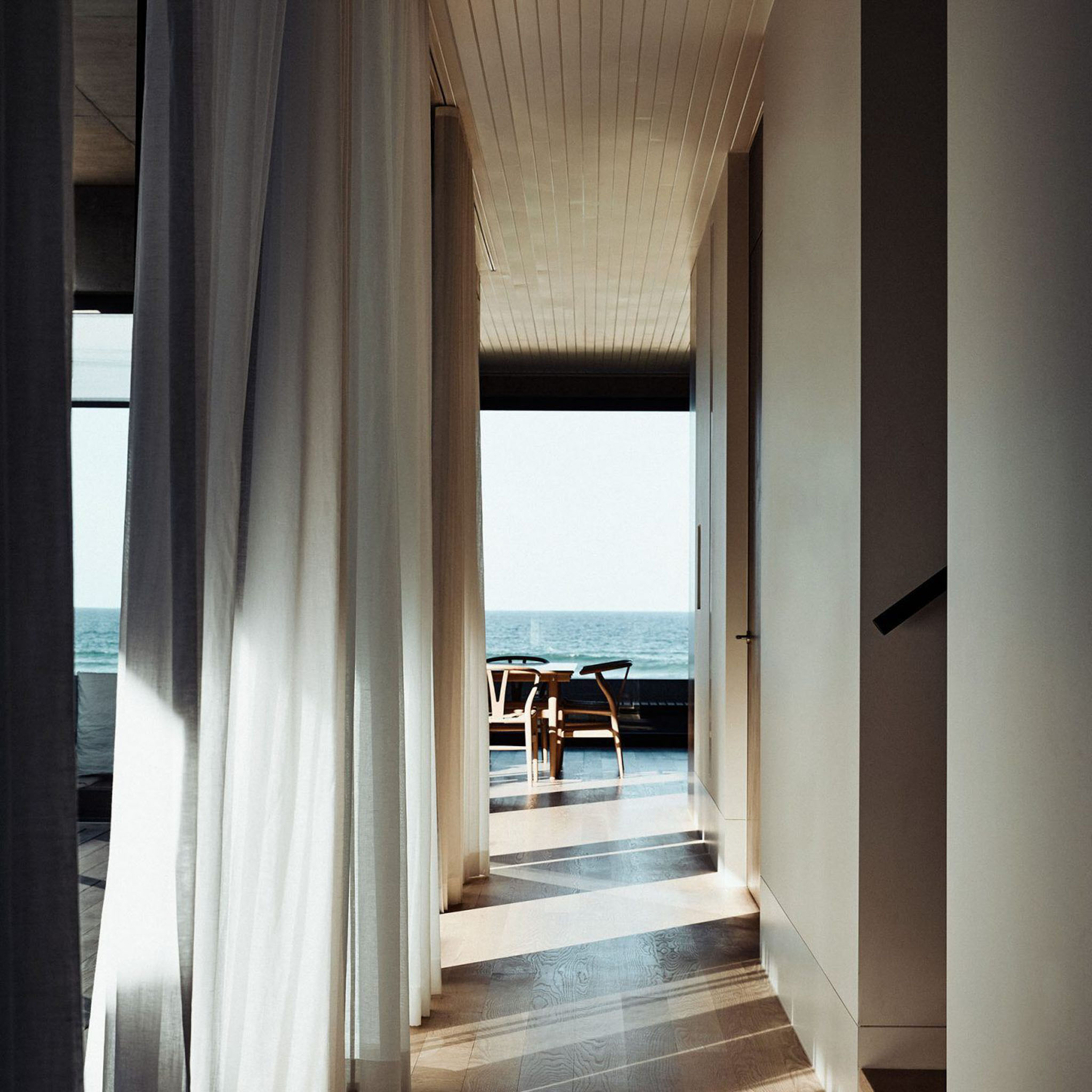 El interior evita la fragmentación: los espacios se suceden de forma fluida, orientados hacia la terraza y la playa. La cocina, el estar y las zonas de reunión se benefician de conexiones visuales directas con el océano, mientras que las áreas privadas conservan un carácter más introspectivo sin renunciar a las visuales lejanas.