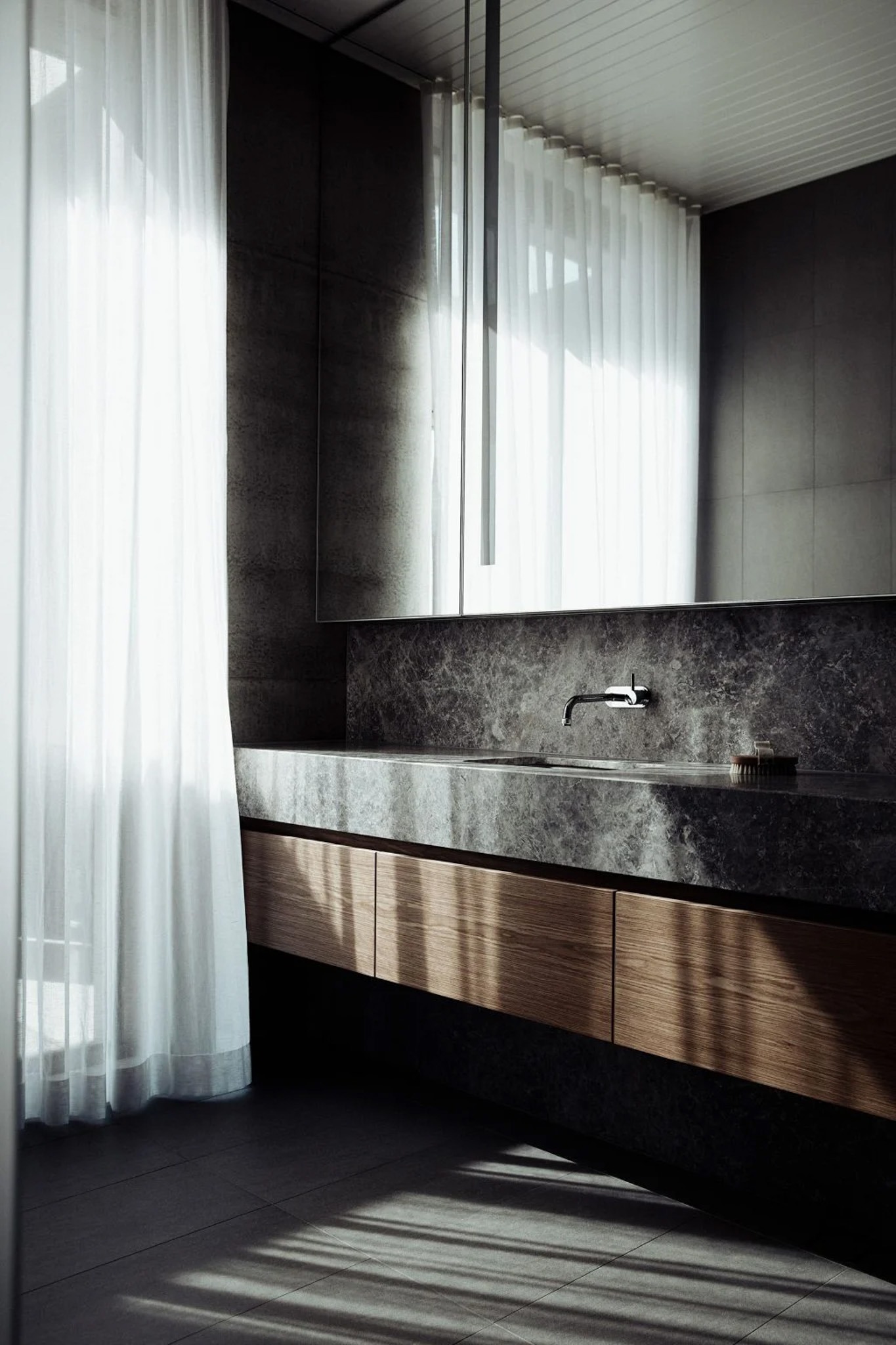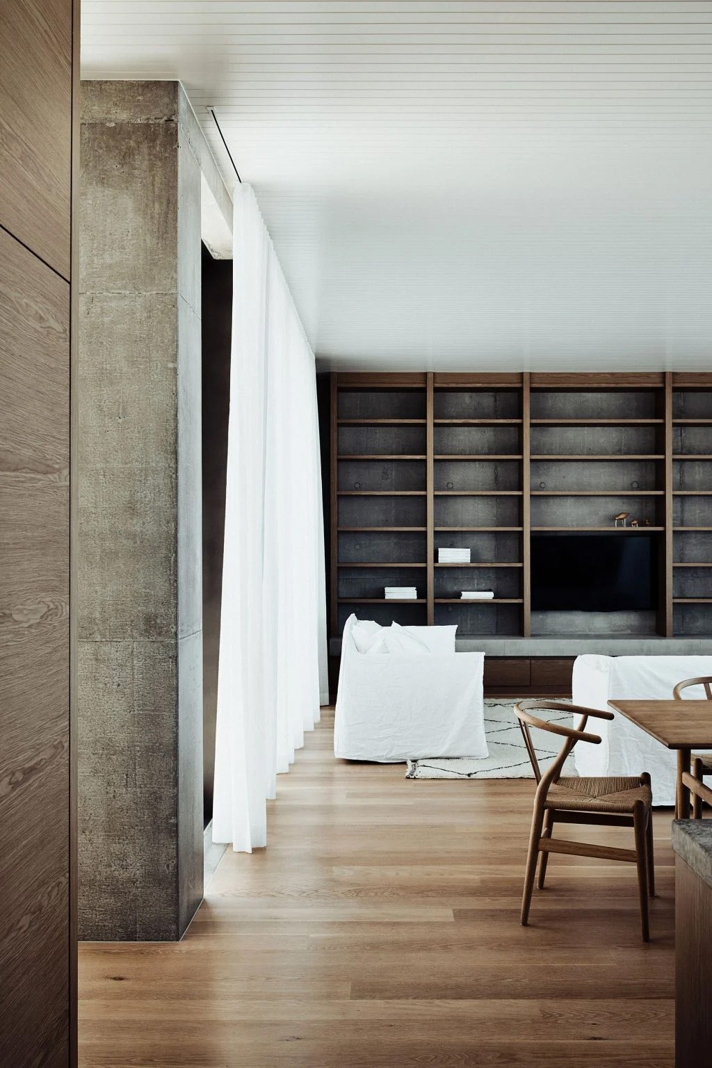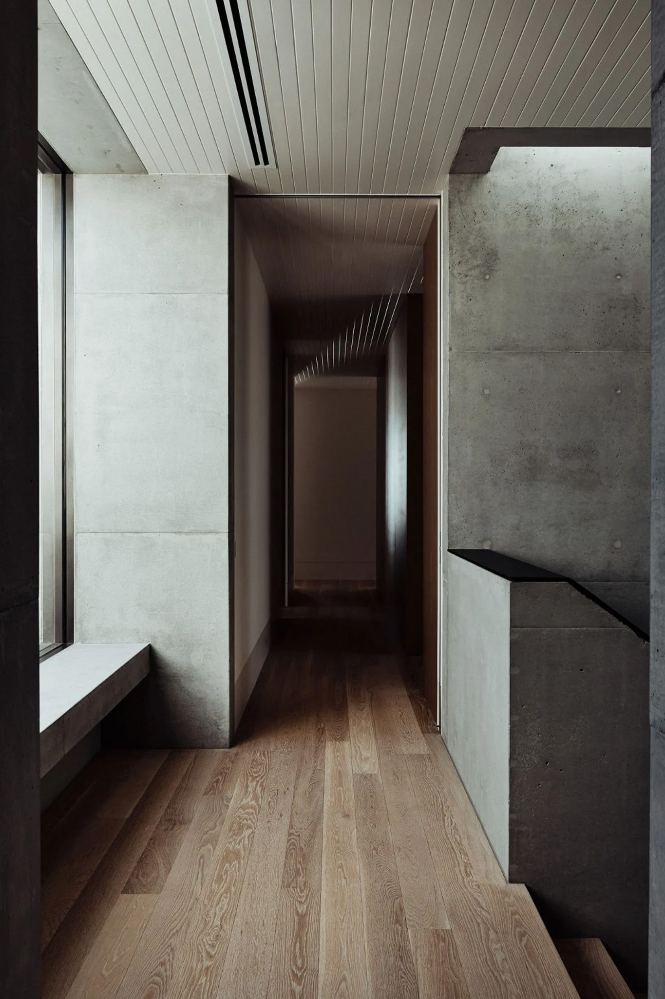 El contraste entre hormigón visto y madera natural es uno de los rasgos definitorios de esta casa. El hormigón, aplicado tanto en el exterior como en el interior, dota al edificio de una sensación de robustez y permanencia, apropiada para un clima severo. Sus muros gruesos actúan como aislantes térmicos, absorben y moderan el calor del sol y generan una inercia térmica que contribuye a estabilizar la temperatura de los espacios interiores.