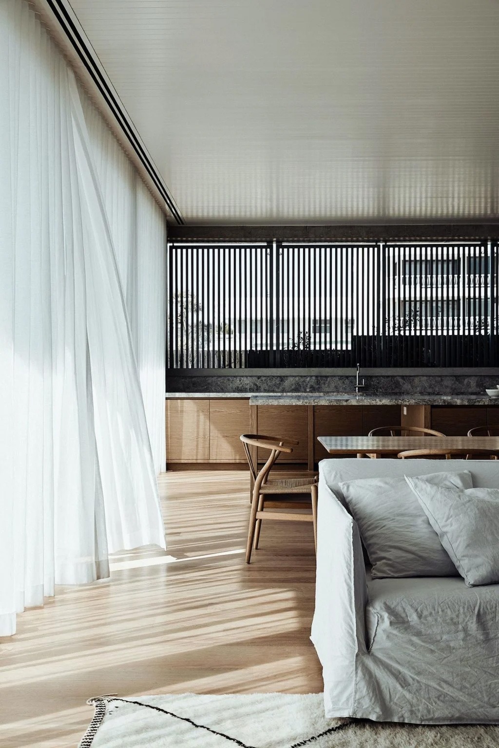 La posición en primera línea de playa implica desafíos climáticos importantes. Frente a ellos, B.E Architecture incorpora persianas de madera operables y un sistema de ventilación cruzada natural que permite refrescar el interior sin recurrir a sistemas mecánicos intensivos. Esta estrategia pasiva reduce el consumo energético y favorece una relación más directa entre arquitectura y clima.