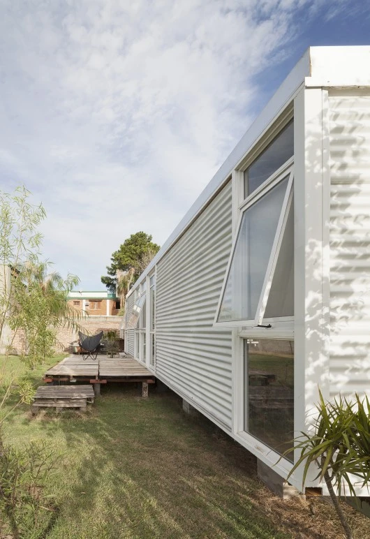 Este prototipo de promoción de viviendas se encuentra en Santo Tomé (Santa Fe, Argentina), en una zona residencial donde la escala del vecindario y sus hábitos predominan. El proyecto emerge de la habilidad de crear un sencillo núcleo de viviendas, tanto en diseño como en ejecución. El objetivo principal fue construir un núcleo pequeño que tuviera las funciones básicas de un hogar, por lo que se decidió trabajar con materiales industriales que fueran fáciles de instalar y operar. El núcleo está modulado a base del material predominante; es más, fue posible optimizar cada elemento constructivo en el sitio, evitando la generación de deshechos y reciclando cuantos más componentes posibles.