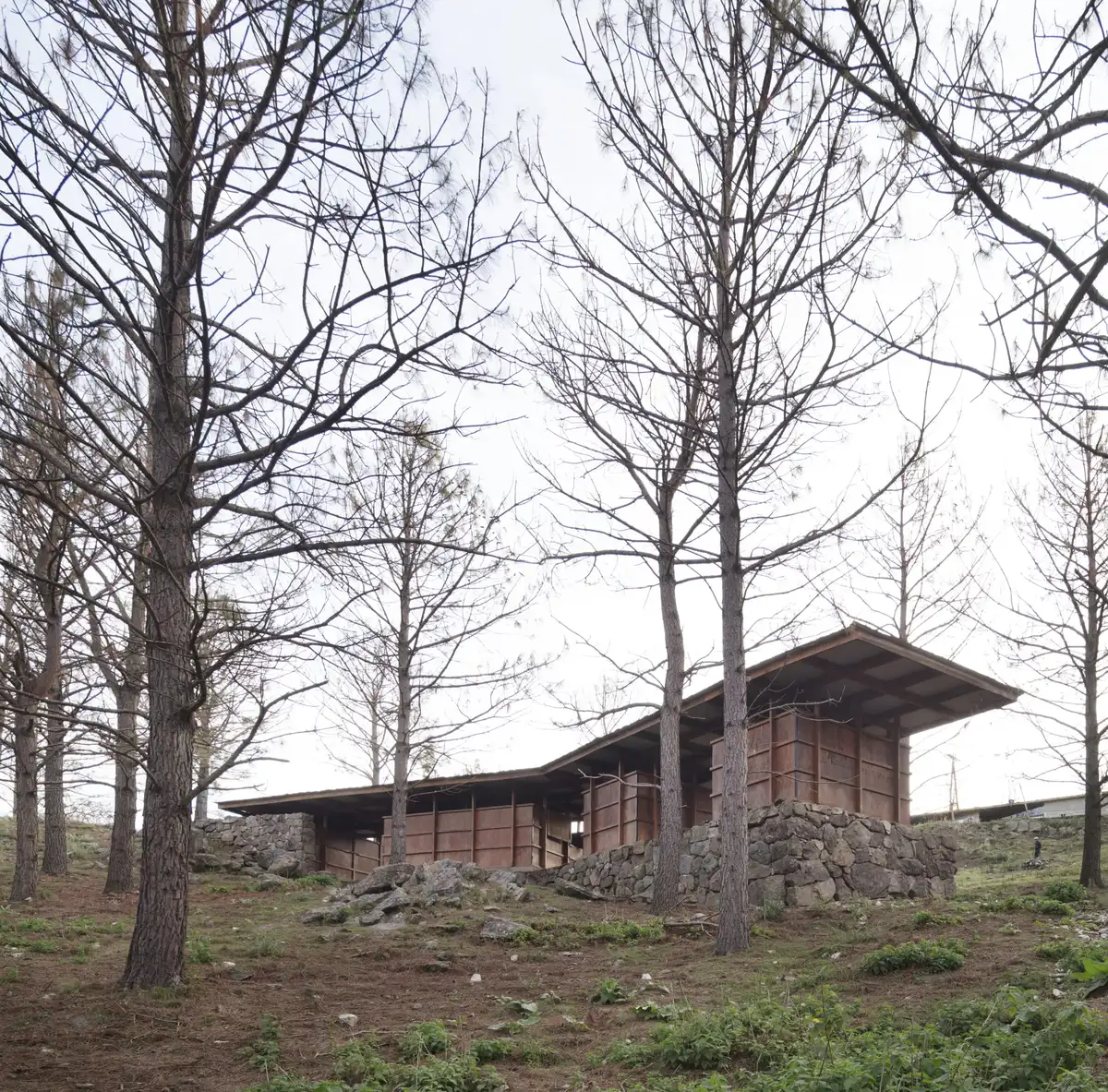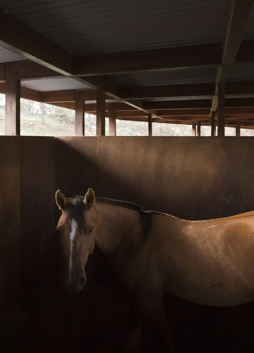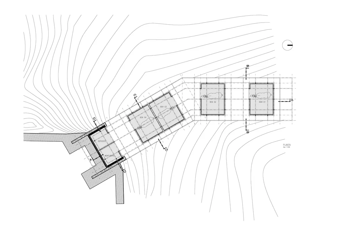 Los diferentes volúmenes que conforman los cuatro establos individuales son entramados de madera que se fijan a la base de hormigón mediante uniones metálicas. Además, un quinto módulo construido con piedra local alberga el pequeño almacén donde guardar las sillas de montar y los demás arreos para los caballos.