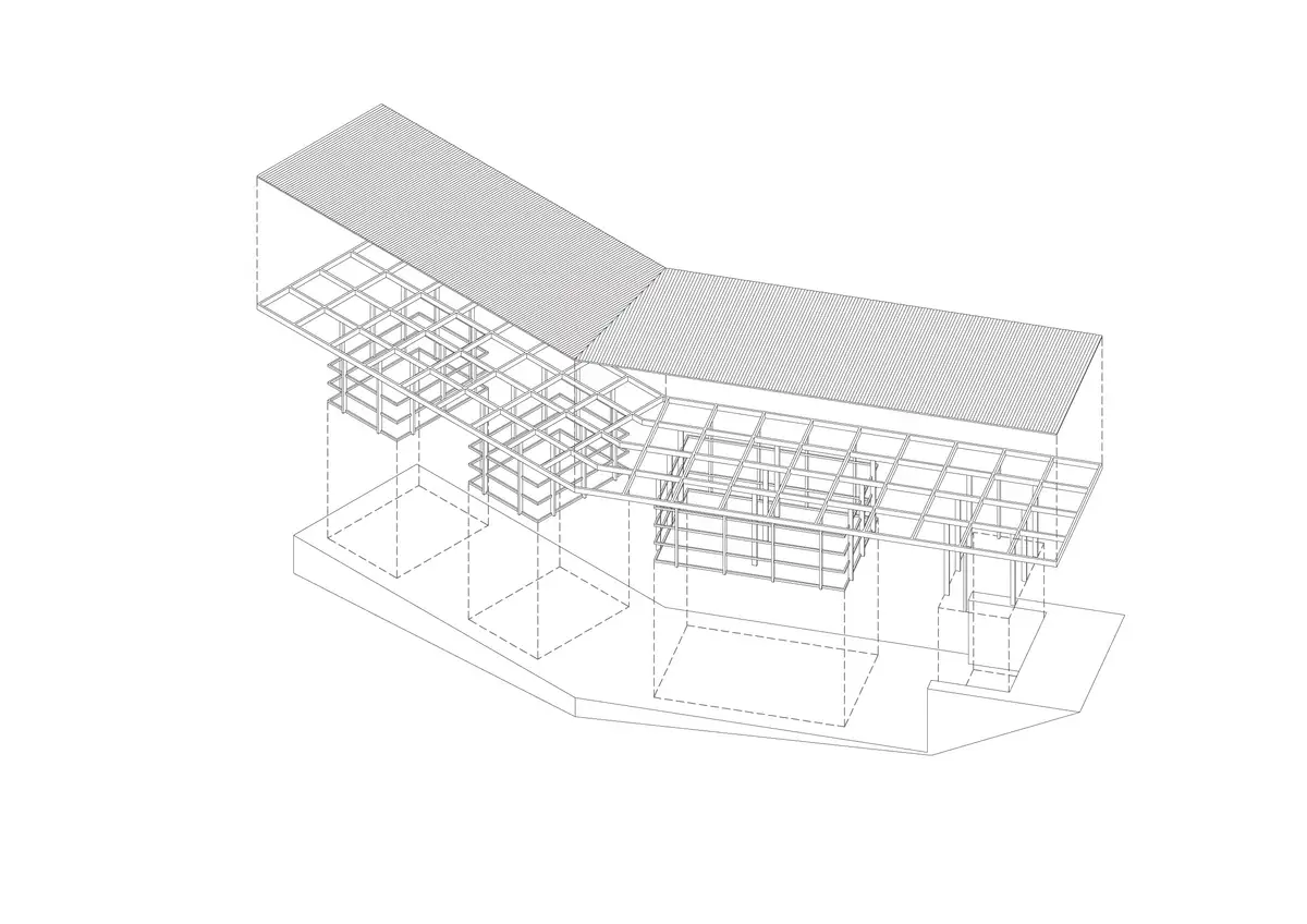 Cabe destacar la especial importancia que cobra en el proyecto la cubierta sobreelevada: en lugar de servir de apoyo, las vigas parecen alzar un tejado casi plano (solo un 2 % de pendiente) revestido de chapa acanalada. Una vez más, la presencia de espacios vacíos aligera la obra y deja que el entorno natural atraviese las caballerizas. Semiocultas por la extensión arbolada, se integran de forma impecable en el perfil de la ladera.