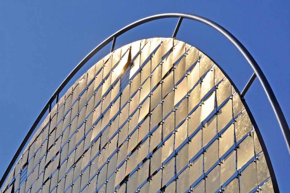 El continuo cambio de posición de las placas metálicas origina diversos efectos visuales a lo largo del día y también por la noche, con la iluminación artificial. Esta rueda solar portuguesa también responde a las variaciones de luz, creando un atractivo espectáculo tanto en el propio círculo como en los reflejos provocados sobre la superficie del agua en la fuente.