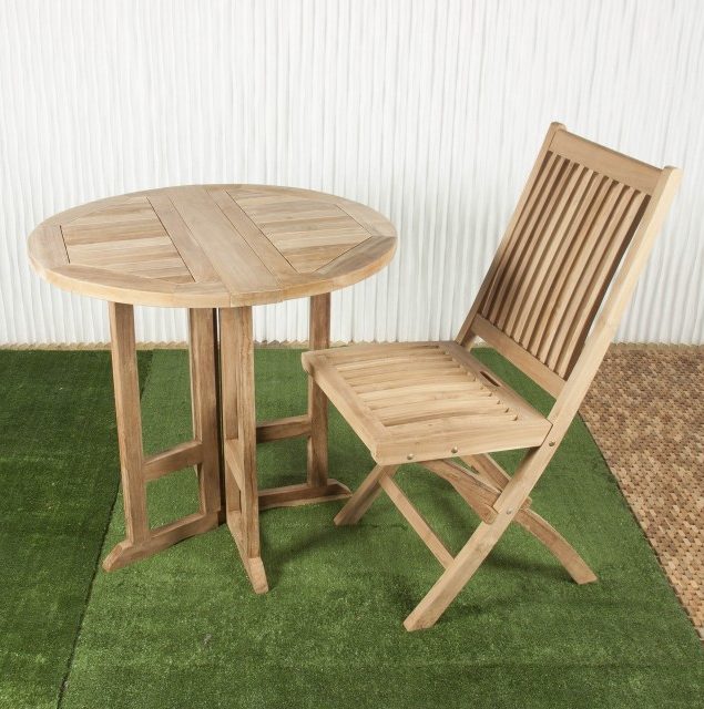 O bien, por una mesa de exterior redonda más pequeña, como ésta mesa exterior elaborada en madera de teca, proviene de Indonesia y dispone de dos alas plegables. Tiene una altura de 75 centímetros y un diámetro de 80.