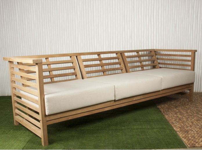 La colección BAT para exterior también es una buena opción si dispones de mayor espacio en tu terraza o jardín, échale un vistazo a este sofá de exterior de tres plazas en madera de teca. Su diseño es más cerrado, ya que los reposabrazos están a la misma altura que el respaldo. Aun así, es un diseño muy llamativo.
