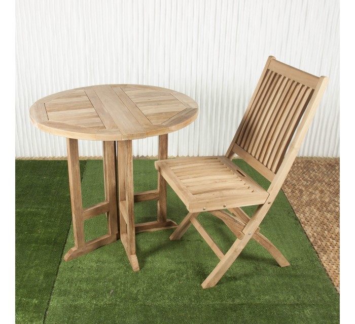 O bien, por una mesa de exterior redonda más pequeña, como ésta mesa exterior elaborada en madera de teca, proviene de Indonesia y dispone de dos alas plegables. Tiene una altura de 75 centímetros y un diámetro de 80.