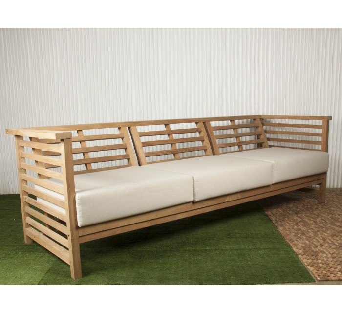 La colección BAT para exterior también es una buena opción si dispones de mayor espacio en tu terraza o jardín, échale un vistazo a este sofá de exterior de tres plazas en madera de teca. Su diseño es más cerrado, ya que los reposabrazos están a la misma altura que el respaldo. Aun así, es un diseño muy llamativo.