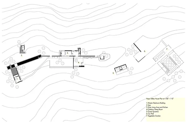 NAPA House está situada en las colinas del Valle de Napa en California (EE.UU.) en una parcela empinada y rocosa. Es un proyecto de Steven Harris Architects para los padres de uno de sus socios, también arquitecto.