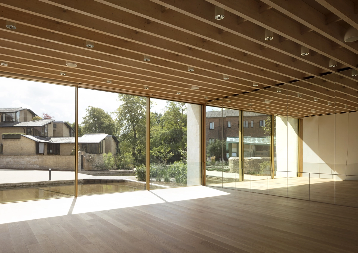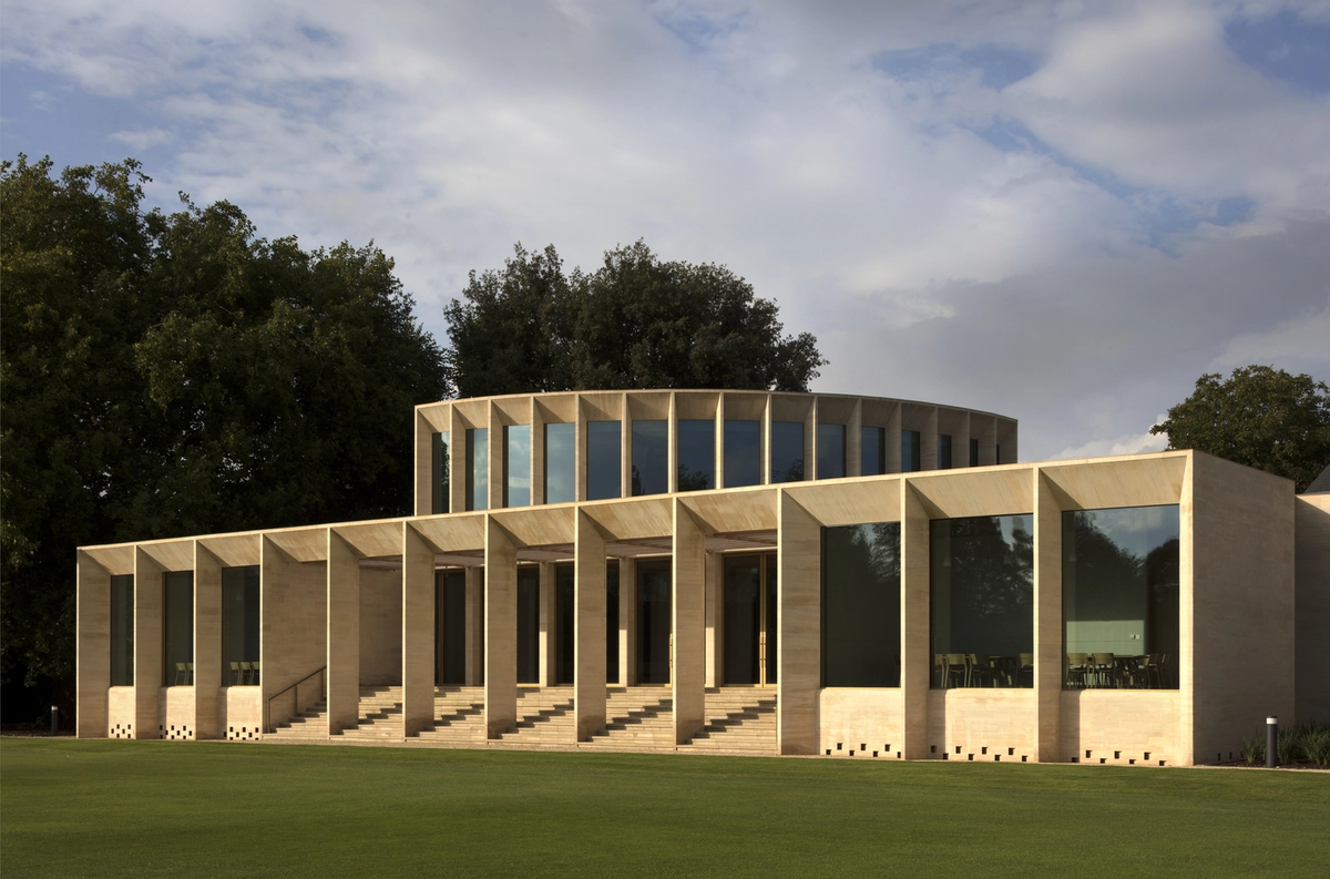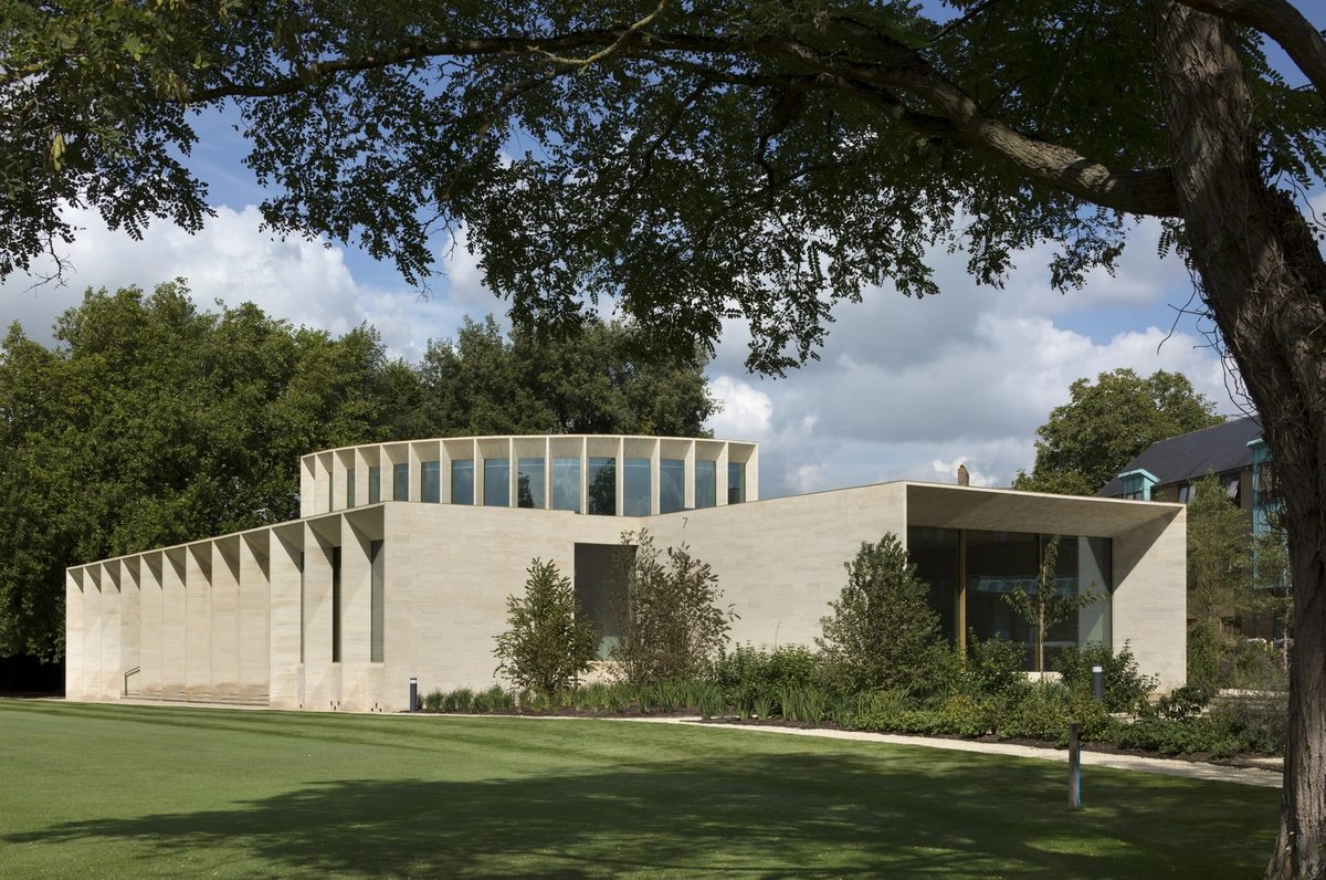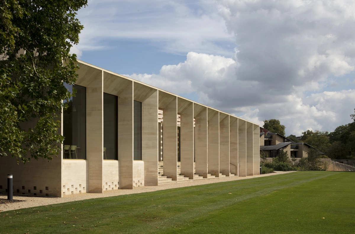La complejidad de la misión estribaba en ajustar las instalaciones a un entorno natural –con jardín, áreas arboladas y un lago cercano– sin perder funcionalidad. Para ello, se diseñó como un teatro al aire libre elevado sobre un podio. El estilizado auditorio curvado en piedra se abre hacia un vestíbulo con techo de roble que se prolonga en pérgolas y terrazas con vistas al campo de críquet. El patio conecta el centro con el Sainsbury Building (construido en 1982 para alojar a los estudiantes) y con otros jardines.