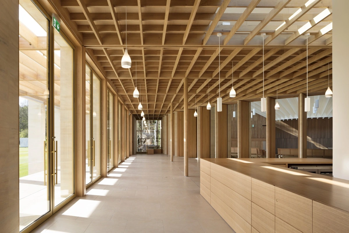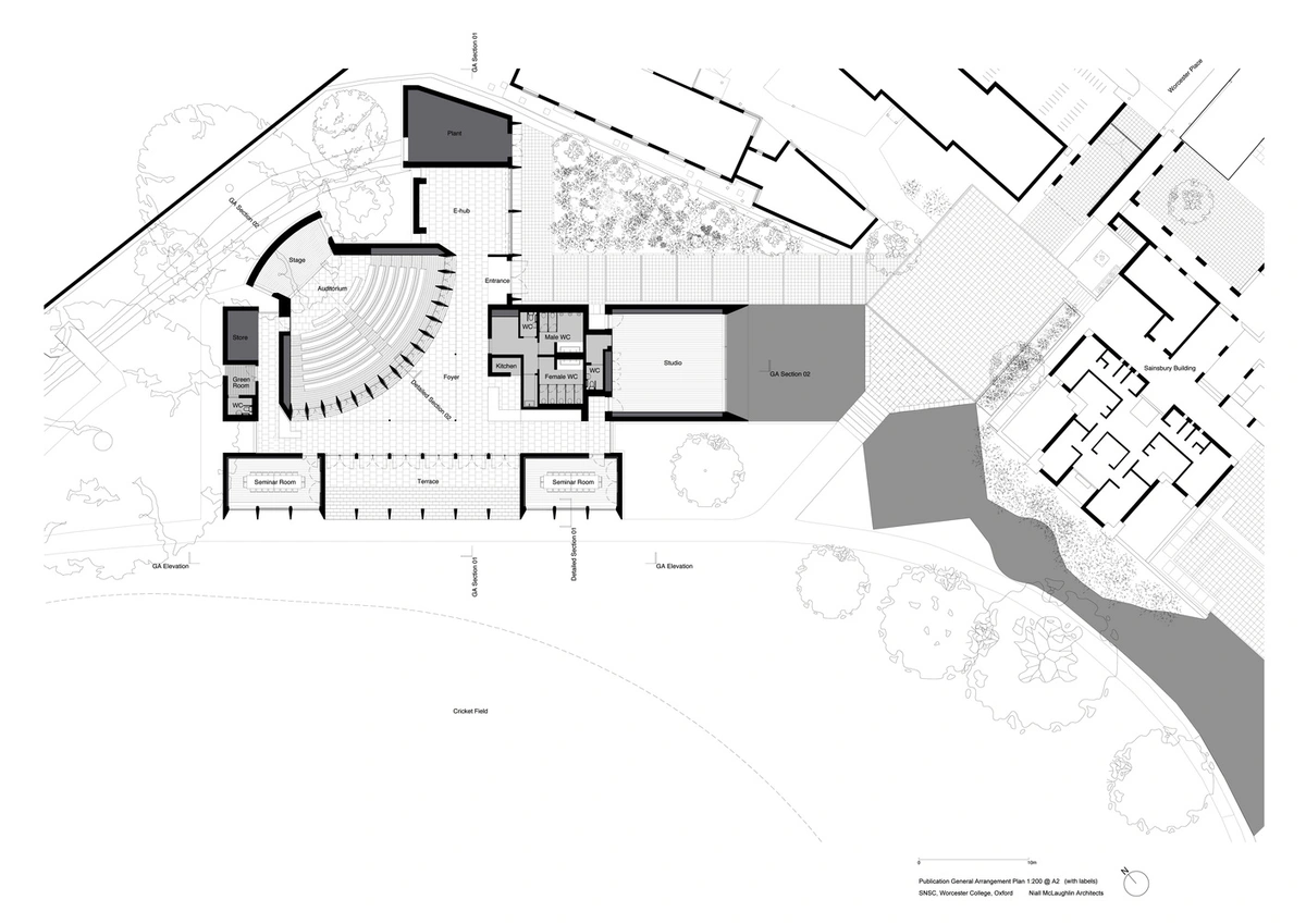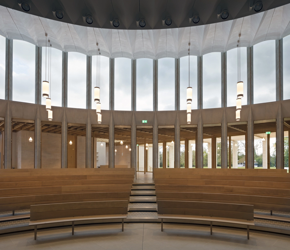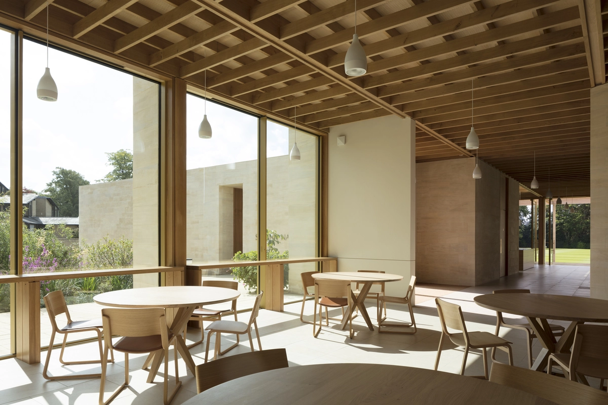 La complejidad de la misión estribaba en ajustar las instalaciones a un entorno natural –con jardín, áreas arboladas y un lago cercano– sin perder funcionalidad. Para ello, se diseñó como un teatro al aire libre elevado sobre un podio. El estilizado auditorio curvado en piedra se abre hacia un vestíbulo con techo de roble que se prolonga en pérgolas y terrazas con vistas al campo de críquet. El patio conecta el centro con el Sainsbury Building (construido en 1982 para alojar a los estudiantes) y con otros jardines.