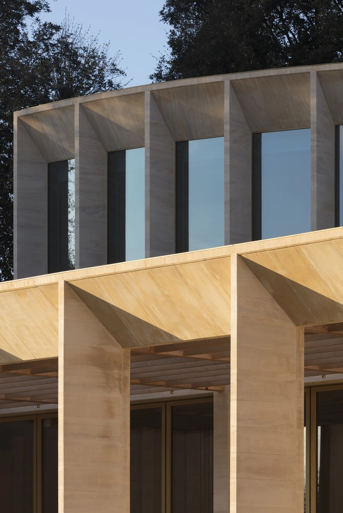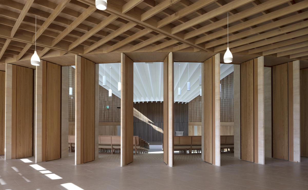 Con el objetivo de potenciar la luminosidad interior en todos los puntos, no se escatimaron las áreas acristaladas, que alcanzan su máxima expresión en un claristorio contemporáneo como remate del auditorio. Su arco con finos perfiles de piedra caliza deja espacios diáfanos para que penetre a raudales la luz natural. No obstante, los pilares de la parte posterior incorporan grandes puertas deslizantes por si se requiere un ambiente más privado o menos luminoso.