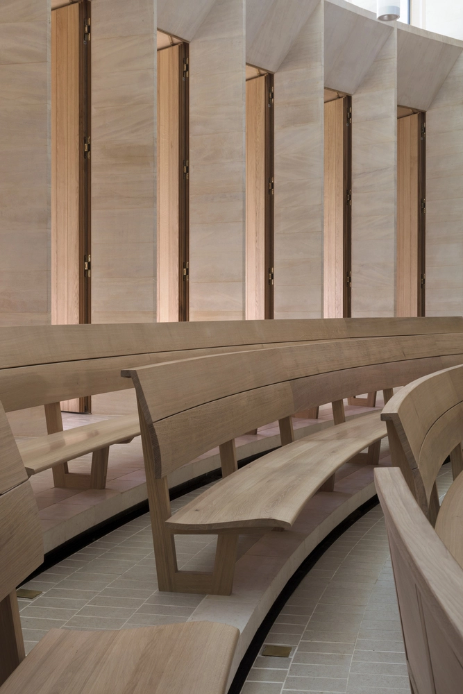 En el interior, revestido en madera, un techo plisado de yeso reforzado con vidrio se va inclinando hacia el escenario. Para ajustarse a la disposición de la sala, el fabricante británico Benchmark elaboró unos elegantes bancos de roble curvado al vapor.