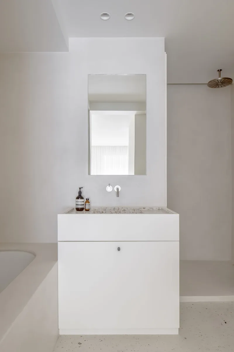 Siguiendo la línea estética propia de Van der Celen, se eligieron unos materiales naturales que persiguen la armonía de tonos, con los colores arena como recuerdo de la playa cercana. Un sabor costero que también se refleja en los suelos de arcilla calcárea con conchas marinas o en el revestimiento en color beis de las paredes de los baños.