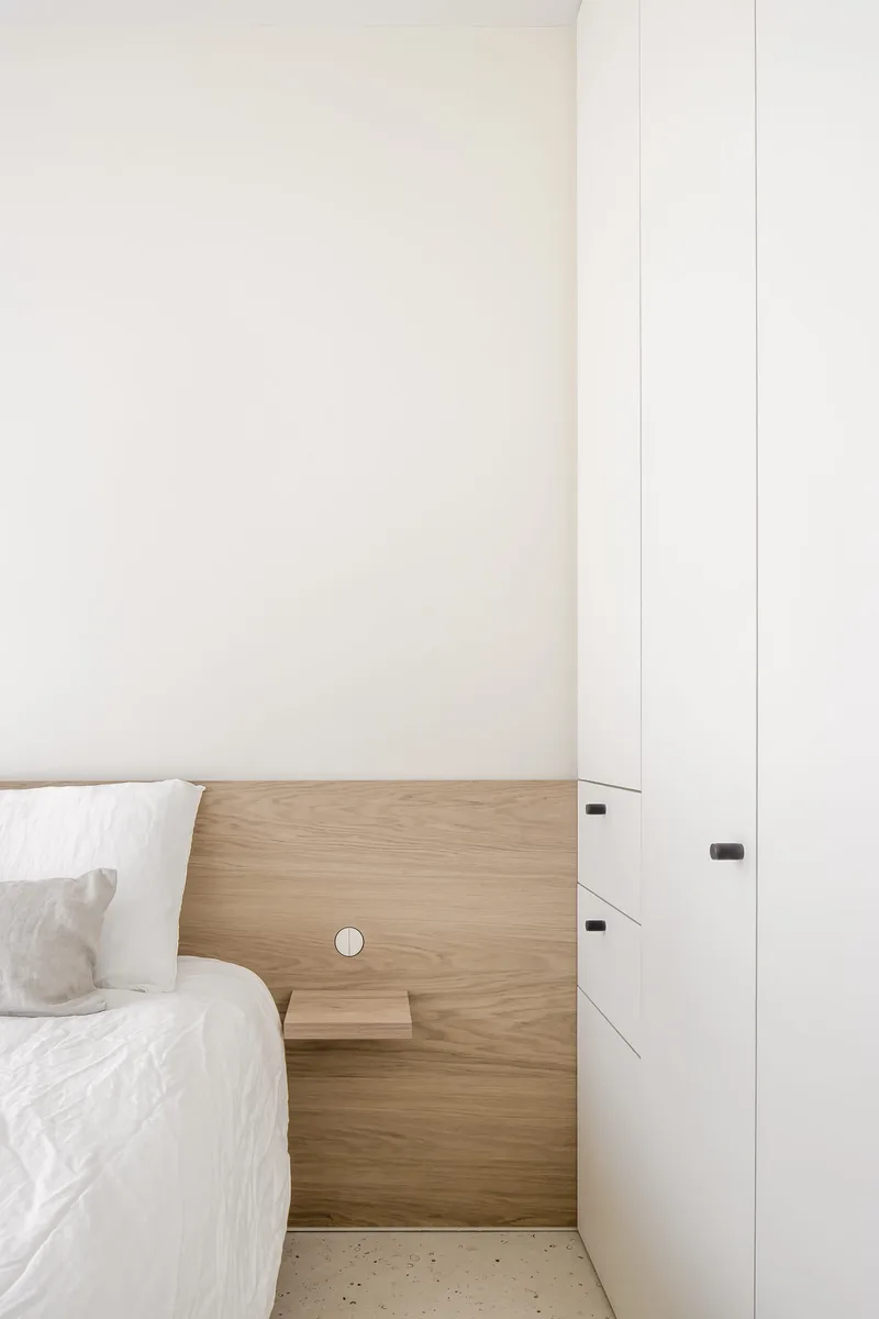 La madera es otro ingrediente fundamental en el proyecto BUN. La chapa de roble proporciona calidez a los interiores, tanto en estanterías, como en mesillas, cabeceros o en el banco corrido del comedor, donde contrasta con la tonalidad más oscura de la mesa.
